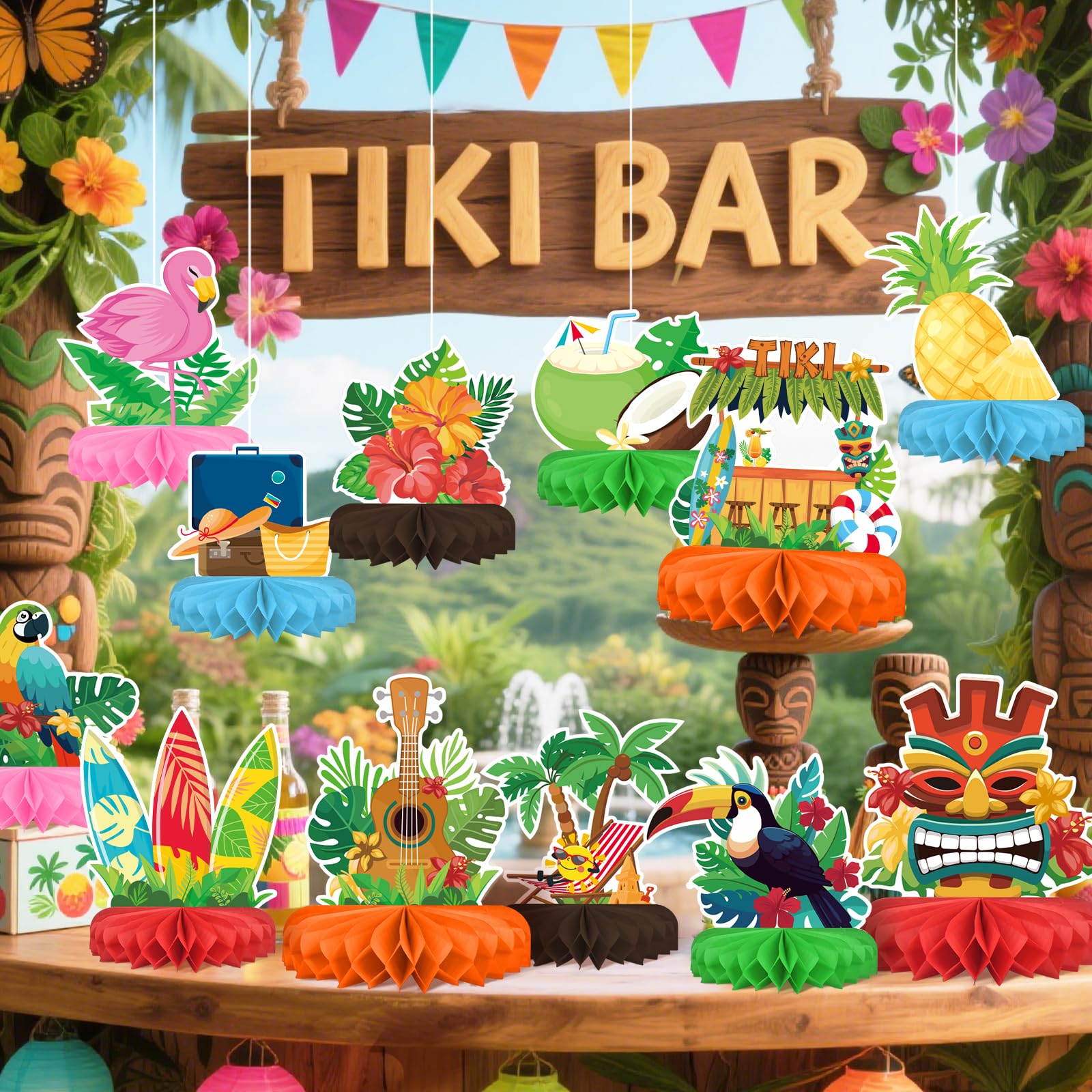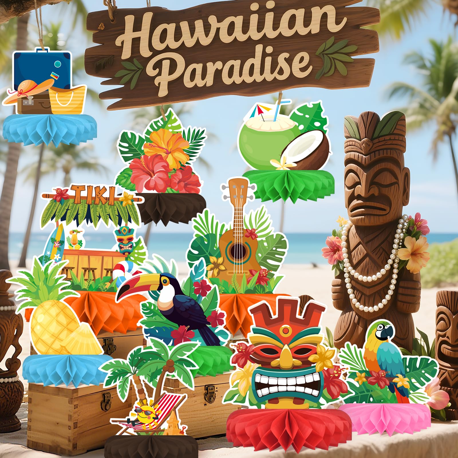 1. Adorable Tropical Designs: Dive into paradise with our Hawaiian party decorations set, featuring 12 pieces of luau honeycomb centerpieces. Each piece showcases a unique tropical design, including coconuts, pineapples, Tiki masks, flamingos, and hibiscus flowers. These vibrant and eye-catching decorations are guaranteed to create an authentic Hawaiian ambiance, making them perfect for any luau party decorations need.