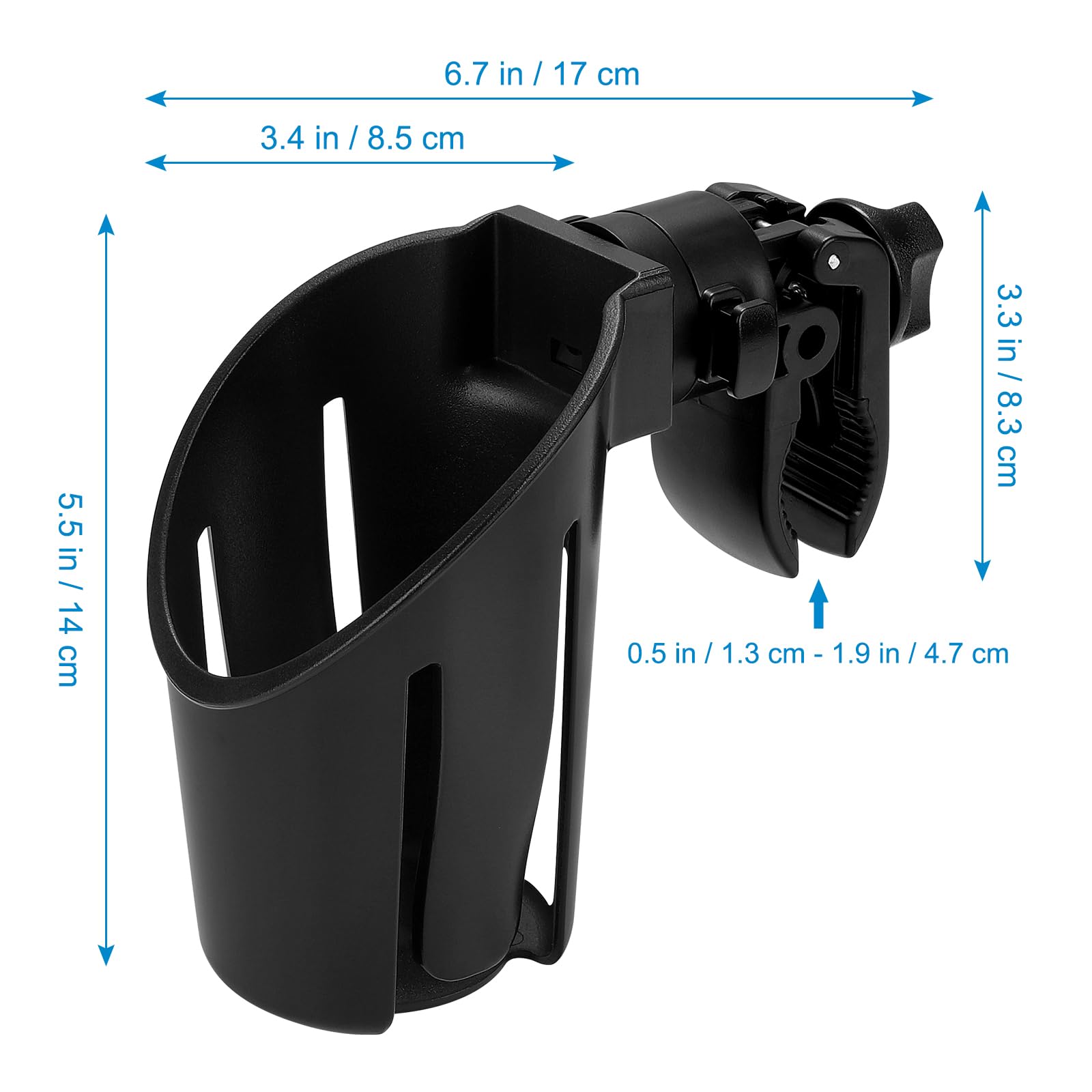 Upgraded Clamp: Extra-Large Jaw Opening : Fits handlebars up to 10 cm (4 inches) in diameter; And the 360° swivel rotatable clamp can be adjusted to any angle for optimal positioning; The serrated design increases the stability of the clip, which can be firmly clamped onto the stroller to maintain stability.