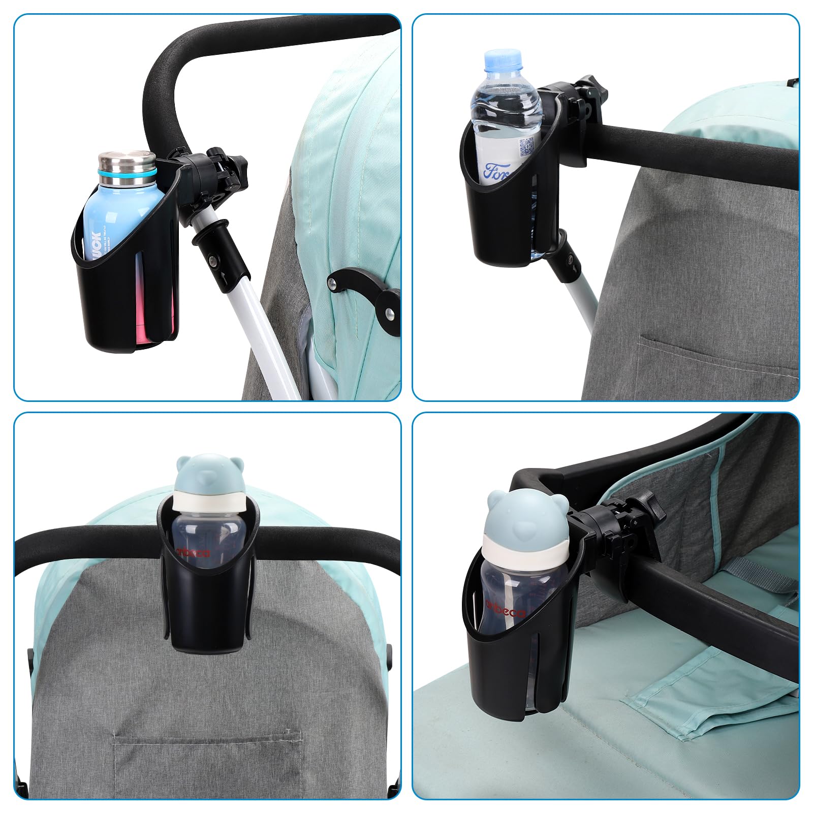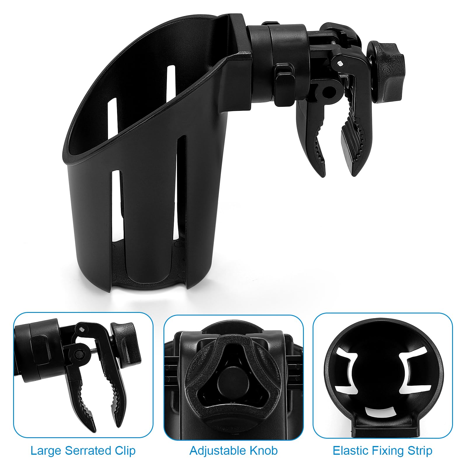 Multifunctional cup holder could be used for stroller, wheelchair, walker, bike, scooter, armrest, trolleys, pushchair, lawnmowers, ATV, treadmill, golf cart, shopping cart, kayak, boat handlebar, motorcycle, beach chair etc.