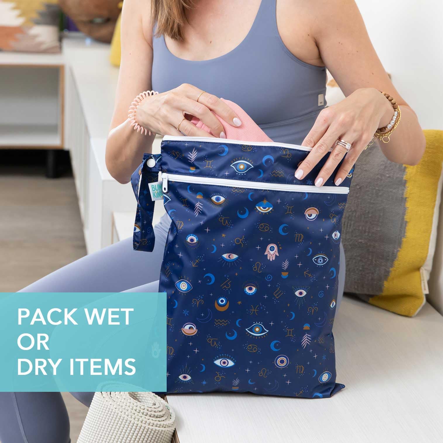 This travel bag has two compartments keep wet and dry items separate. Featuring heat-sealed seams for true waterproof protection. Wet Dry Bags are great for packing dirty gym clothes, a towel, damp swimsuits, diapers, and shoes. Not just for keeping wet stuff away from dry stuff–these bags make excellent organizers for extra clothes, toys, accessories, toiletries, electronics, travel and more! With a snap handle, snap your bag wherever you need it - stroller, changing table or suitcase. Even use for carrying out garbage from outings at the beach, park, picnic, pool, camping. And if you’re traveling with kids, they’re great for organizing books and coloring books, a dry change of clothes, and protecting stuffed animals. Made from Bumkins’ signature lightweight, waterproof and easy-wipe fabric. Measures 12.5 in x16 in (31.8 cm x 40.6 cm). Bag is two-compartment, non-gusseted, non-insulated and non-stretch. Machine washable. To extend the life of the waterproof fabric, we recommend hang drying our quick-dry fabric; always ensure fabric is completely dry before storing. For over 30 years, Bumkins has been creating thoughtful and responsibly made essentials for babies and kids, making parenting easier so families can cherish those special childhood moments. Designed in Arizona, responsibly made in China.