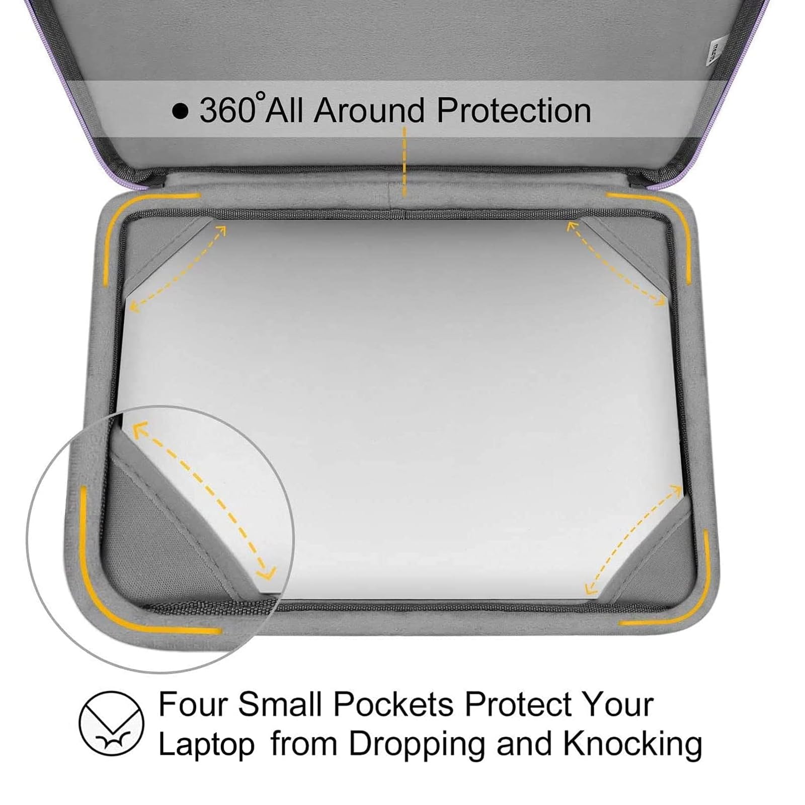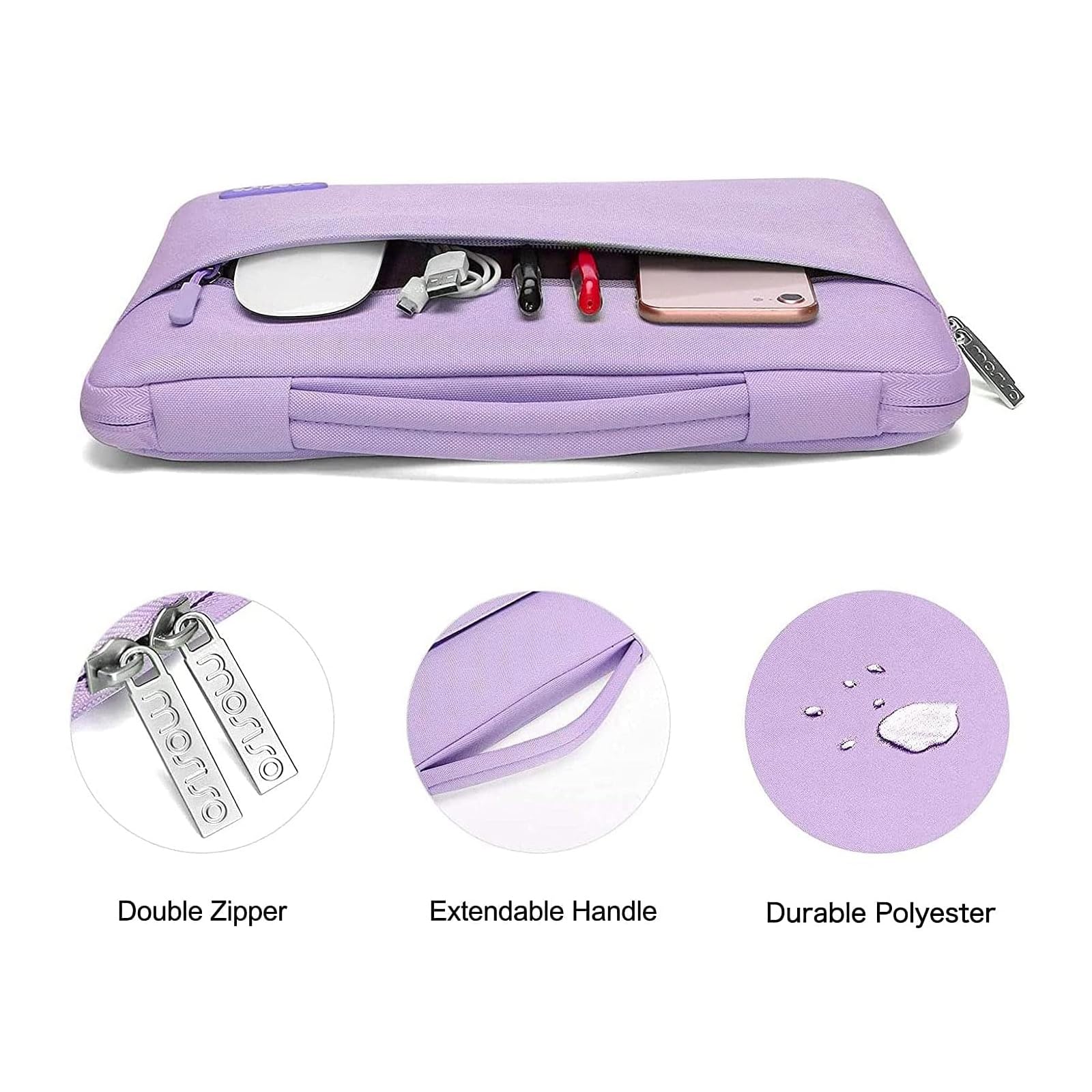 The 360 degree protective shockproof laptop sleeve with handle carrying bag internal dimension: 13.39 x 9.25 x 0.79 inches (L x W x H); external dimension: 13.98 x 9.84 x 0.79 inches (L x W x H). The front side pocket dimension: 11.61 x 9.25 inches (L x W). Made of polyester material, protect your laptop against accidental spills. Slim and lightweight, does not bulk your device up and can easily slide into your briefcase, backpack or other bag. Ideal for business, daily and travel.