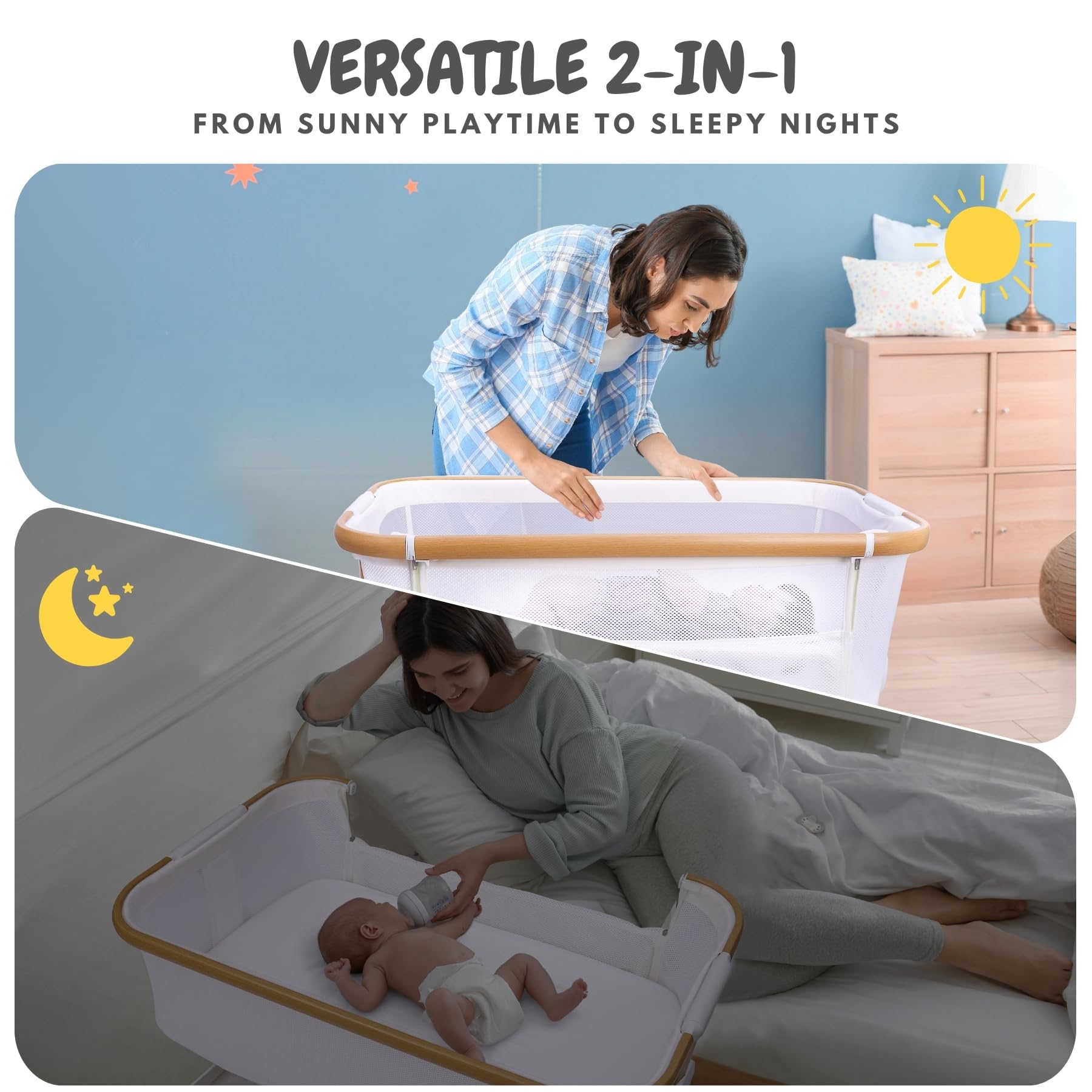 DUAL-FUNCTION COMBO - Effortlessly switch from a standalone newborn bassinet with wheels to a cozy baby bedside sleeper with a simple drop down side. Immerse in precious moments with your newborn while maintaining the utmost safety and comfort.