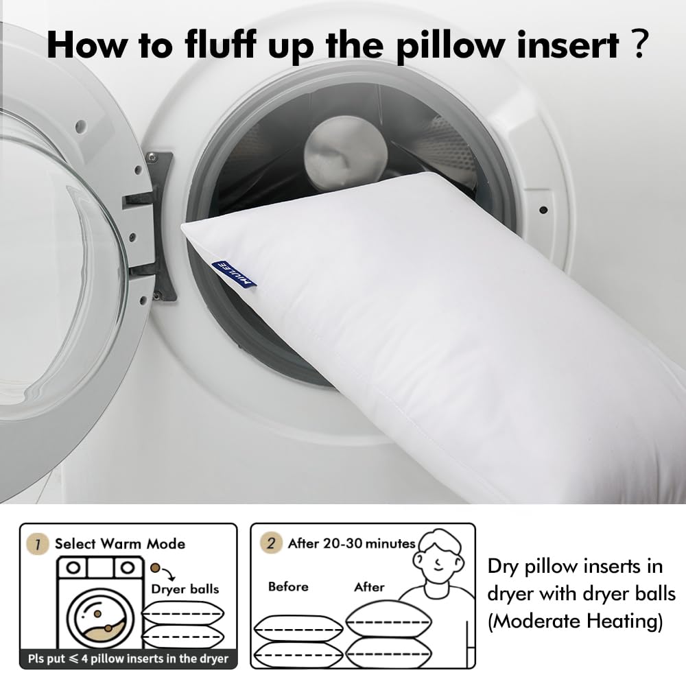 Warm Hint: Dryer is an ideal tool to help make pillow inserts fluffy. Pls dry pillow inserts in dryer with dryer balls on warm mode for 20-30 mins.See image2, pat the pillow insert from both sides towards the center several fimes to make inserts fluffy.