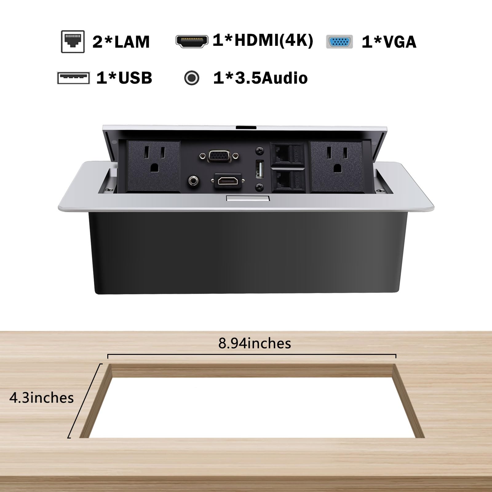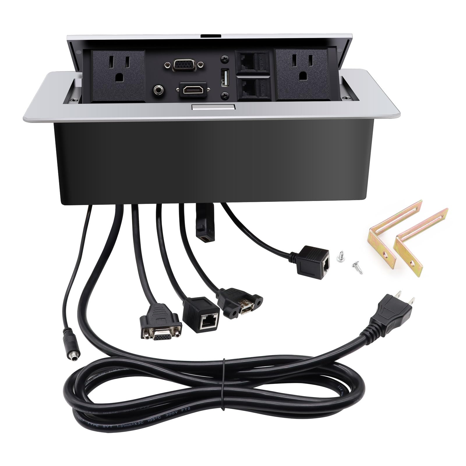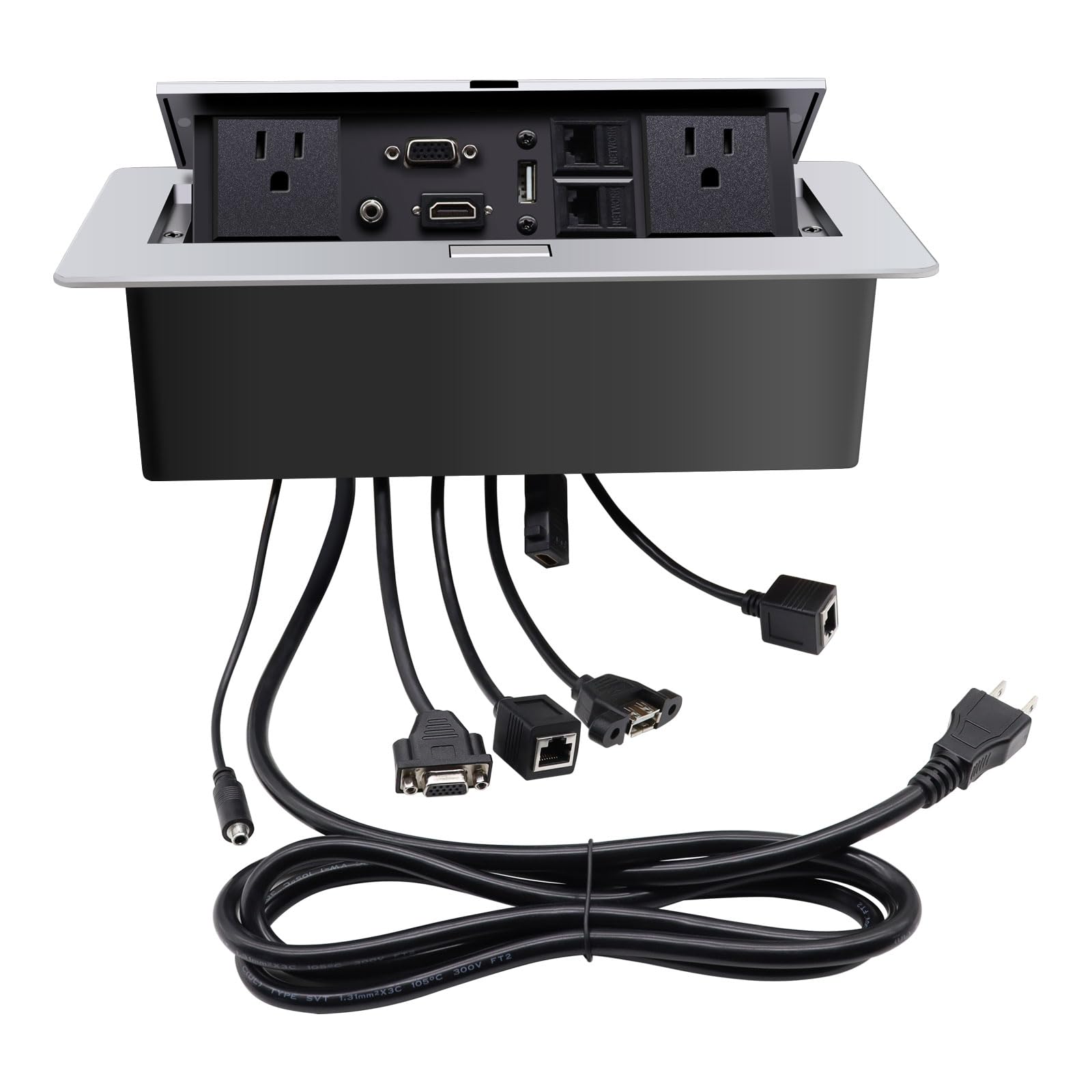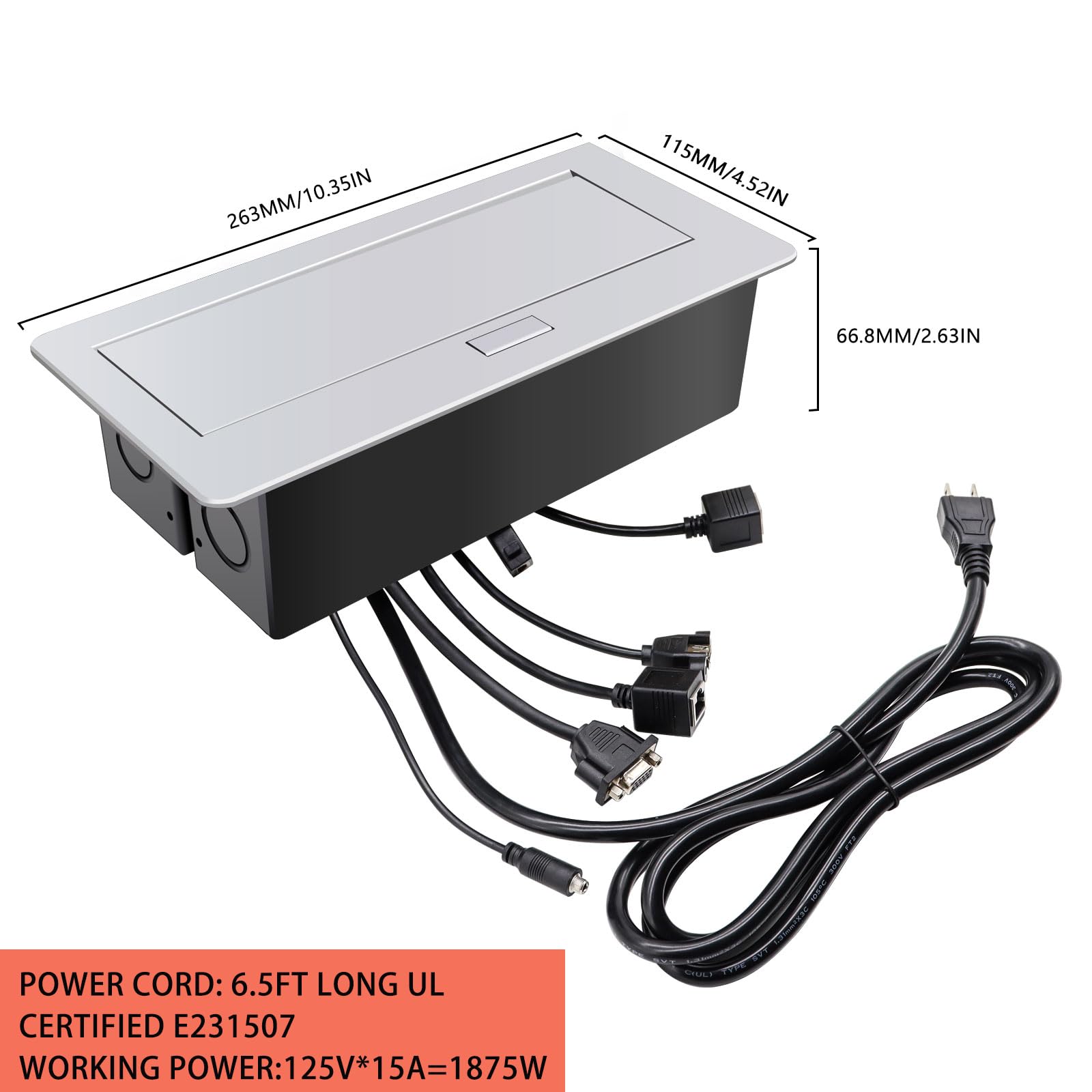 2: Pop up outlet Power Strip, Embedded countertop Pop Up Outlet, 6.5 Feet 16 AWG UL E231507 certificate power cord , 2 AC Outlets . Voltage 125V Current: 15A Power: 1875W, Equipped with 3.5mm audio, dual network ports, HDMI port, USB port, VGA interface, suitable for multimedia teaching and conference table teaching. Computer teaching using multi screen display screens