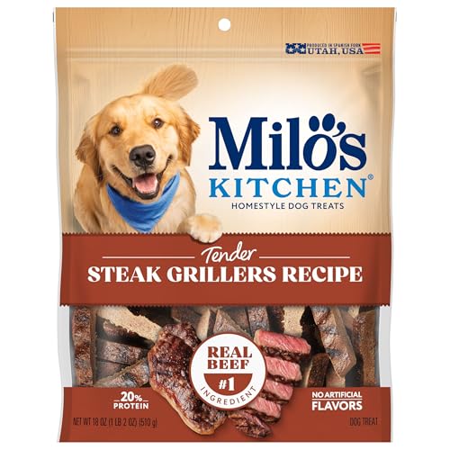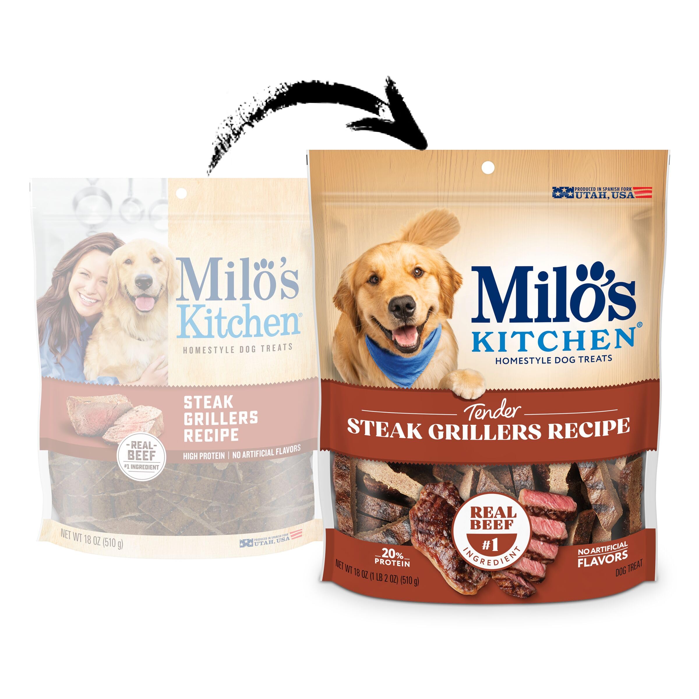 Contains one (1) 18-oz. bag of Milo’s Kitchen Steak Grillers Recipe dog treats