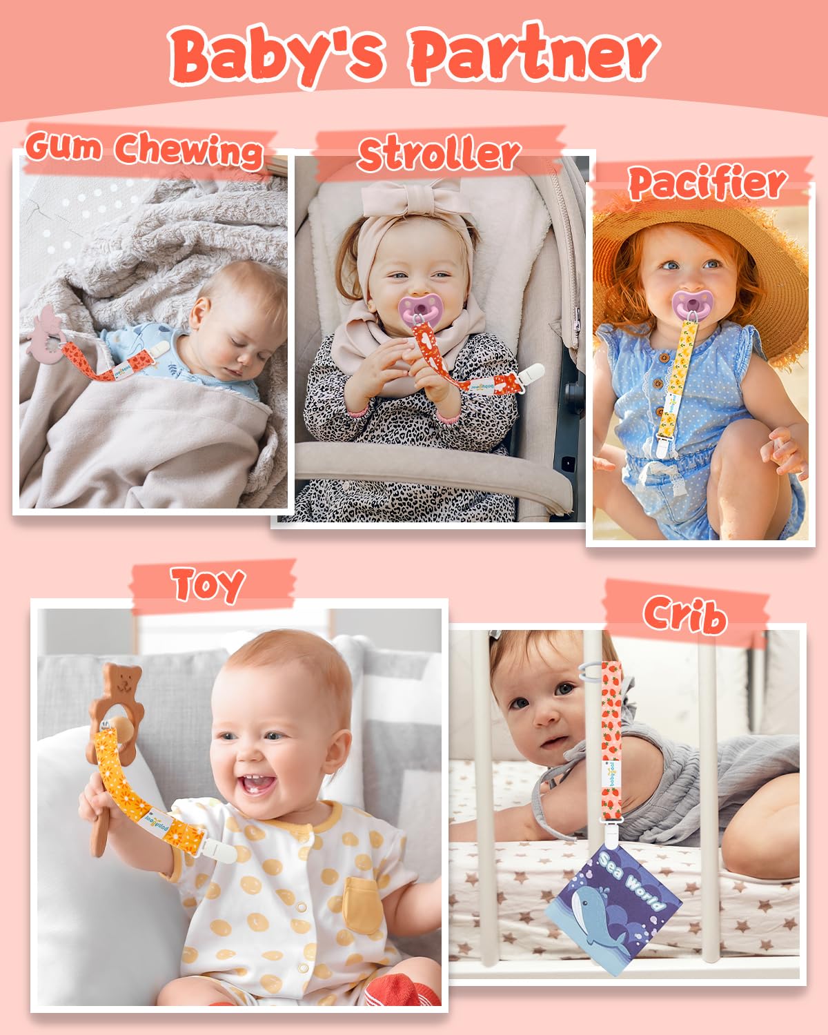 Multifunctional Usage: These pacifier leashes are usually used for soothies, teethers,burp cloths, teething rings and blankets, drool bibs. It is an universal pacifier clip and fits to your favorite brand of pacifier and soother.