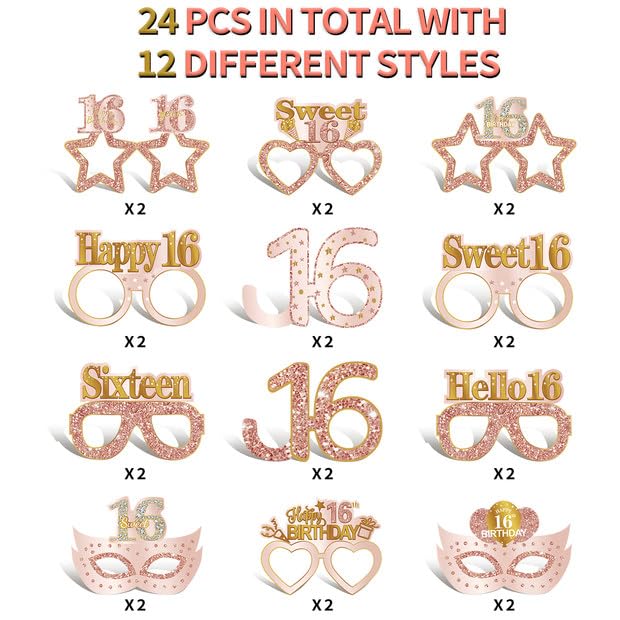 [You Will Get] - 24Pcs Sweet 16th birthday paper eyeglasses decoration for girl, including 12 different design styles that can be freely matched to meet your party needs