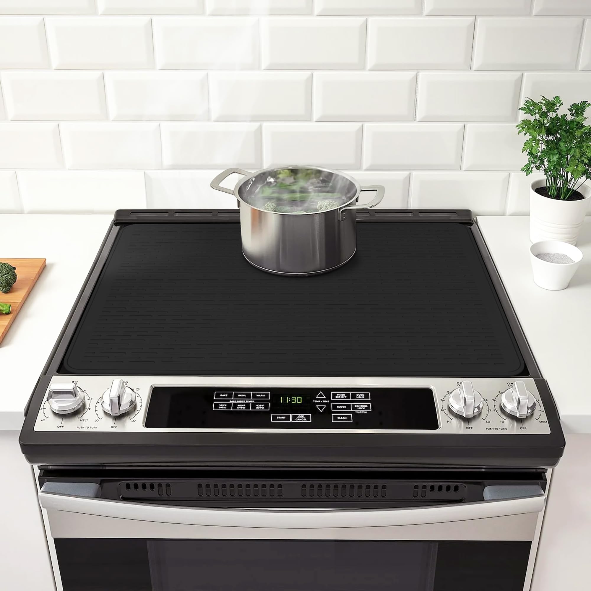 Glass Top Stove Cover:This extra large 36" x 21" inches silicone stove cover for glass top electric stove is perfect for protecting your electric stove top, kitchen counter top, electric cooktop, table, or washer-dryer top from scratches, spills, stains, scrapes, and dirt. It keeps the surface clean and tidy while providing an expandable workbench for food preparation.