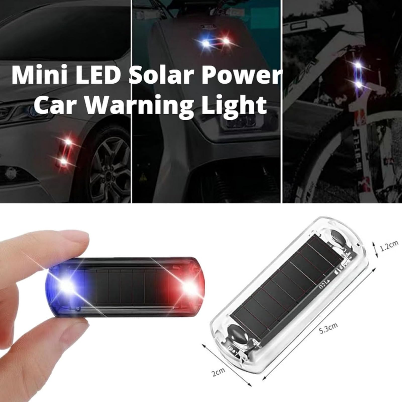 Flashing LED Warning Lamp, Solar Car Flashing Lights, Vechiles Alarm LED Flashing Lamp, Waterproof Warning Strobe Flashing Lamp, Car Alarm LED Flashing Lamp for Motorcycles You can install these lights on cars, motorcycles, or electric vehicles and use them as signal lights. They are solar-powered and have multiple functions, such as warning, or decoration. Specification: Material: ABS & Plastic Name: Solar Car Flashing Light solar panel: 80ma Size: about 5.3x1.6x0.8cm/2.09x0.63x0.31in Weight: about 90g Package Contents 2* Solar Car Flashing Strobe Lights