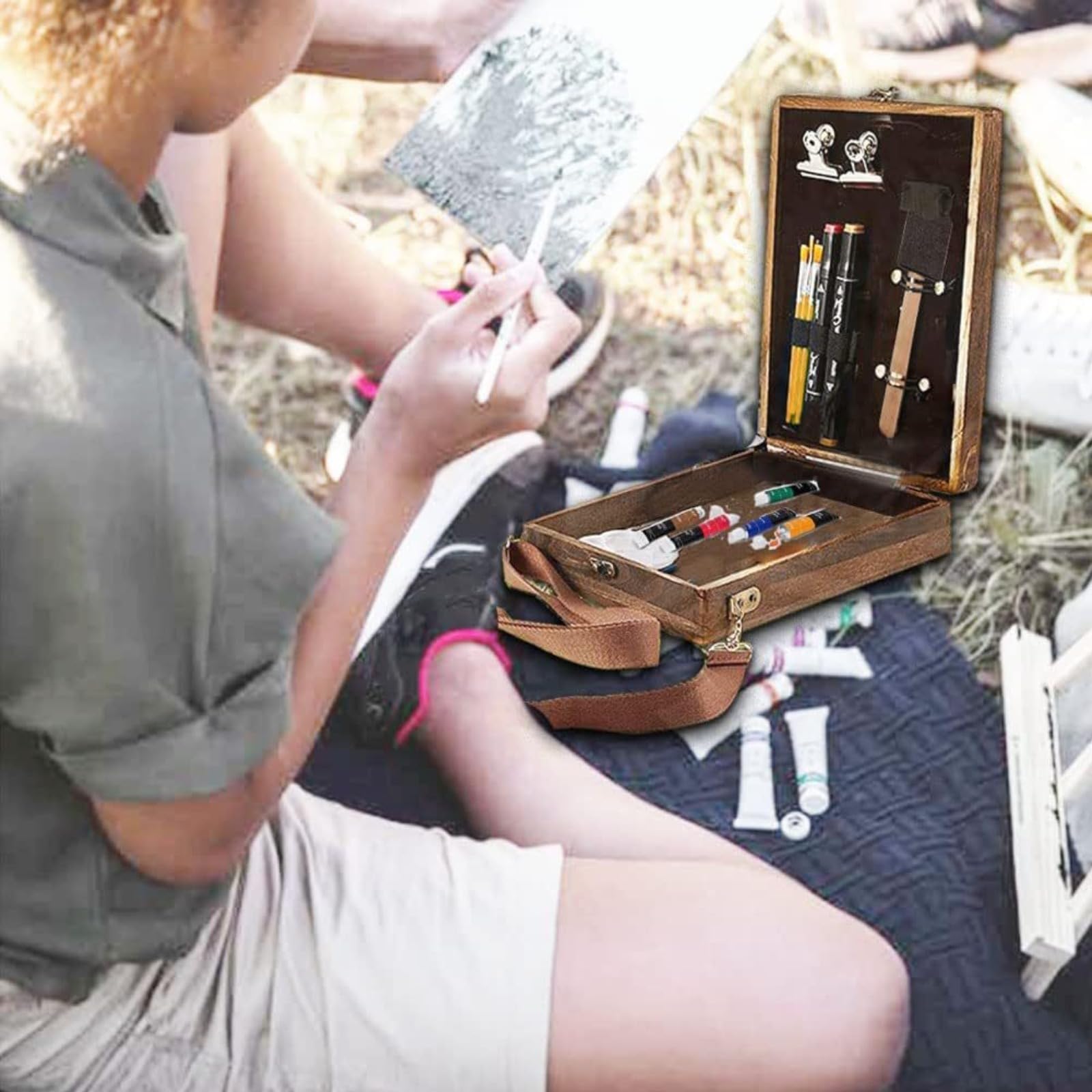Your Portable Creative Studio: Where Vintage Charm Meets Modern Functionality ✨ Triple-Threat Performance More than just an art supply bag – it's a complete mobile workstation for plein air painting, travel art supplies, and writing adventures! This 3-in-1 marvel combines: ✓ A professional pochade box with built-in palette ✓ A portable easel with 3-angle adjustment ✓ A vintage messenger bag for urban explorations 🔍 Built to Endure Generations Weatherproof Seals: Double-layer rubber gaskets protect your art tools from rain/humidity Antique Brass Hardware: Distressed copper hinges and clasps evoke vintage tool box charm 🎨 High-Grade Organization "Finally, a box that fits EVERYTHING!" – Professional Watercolorist Vertical Storage Wall: 5 elastic loops + 3 adjustable bands for paint brushes/rulers/scissors Magnetic Work Surface: Transforms into A5 writing desk instantly (perfect writing box) Hidden Compartments: 2 brass clips + velvet pouch for pigments/ink bottles