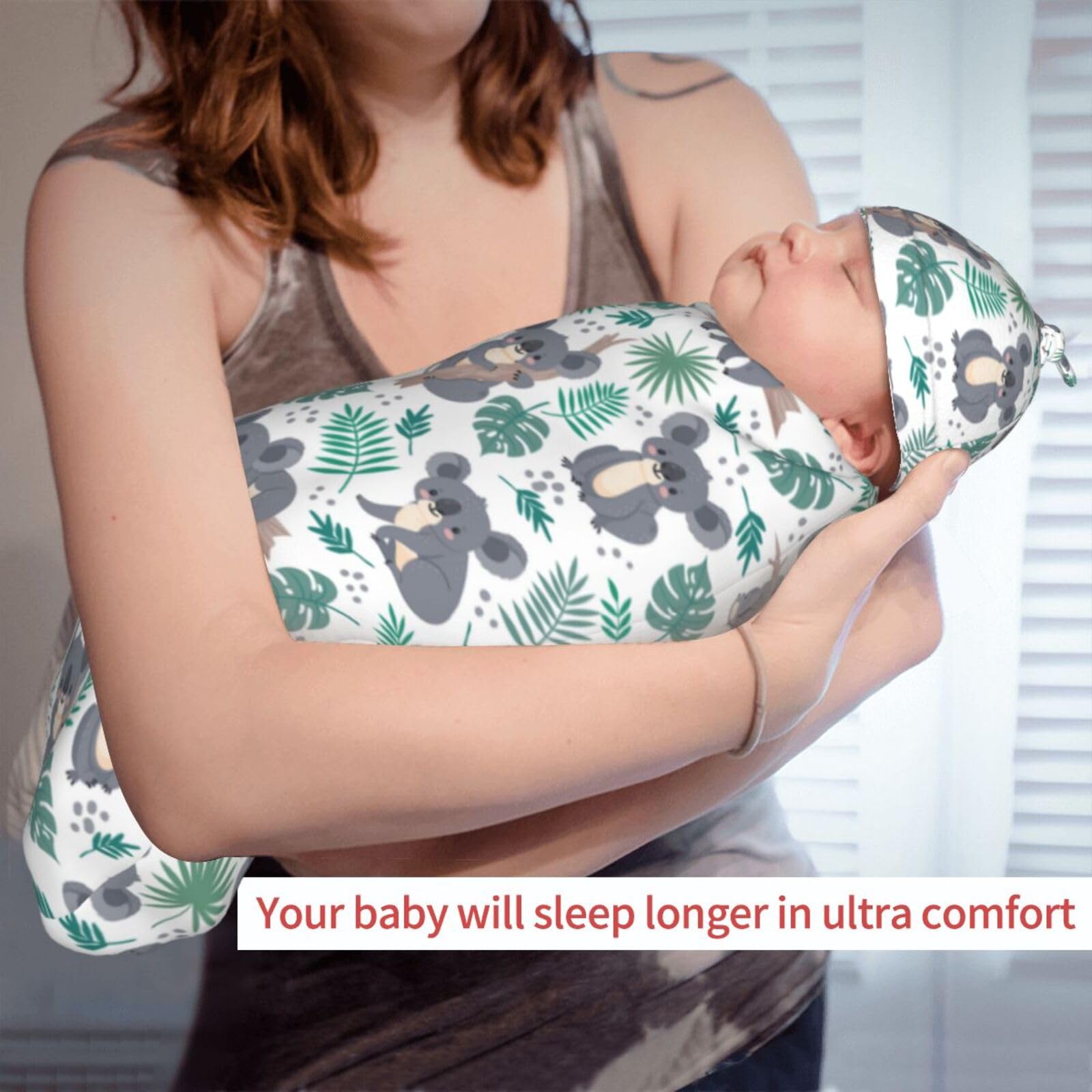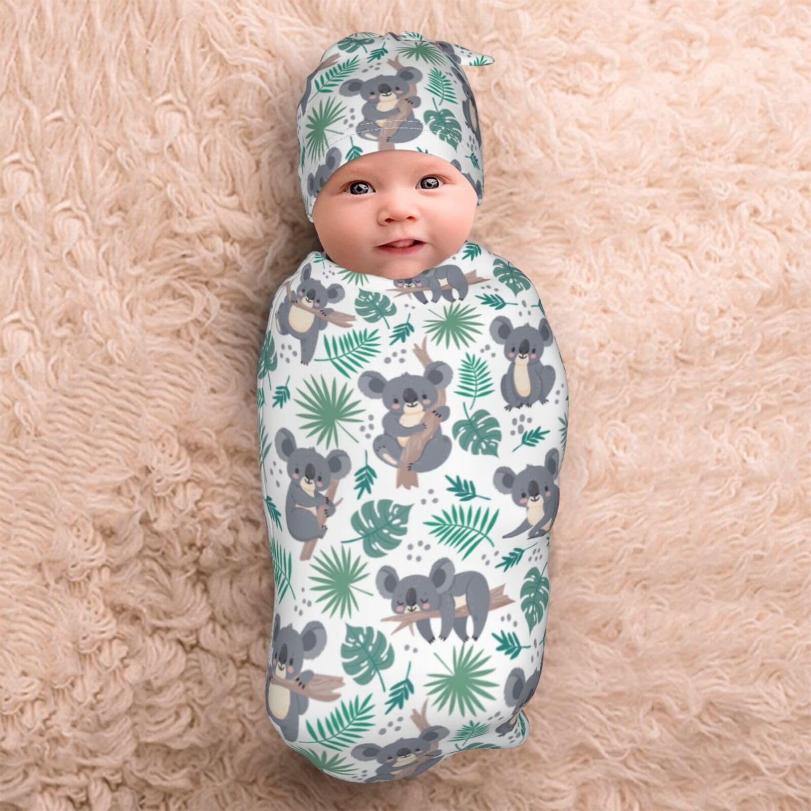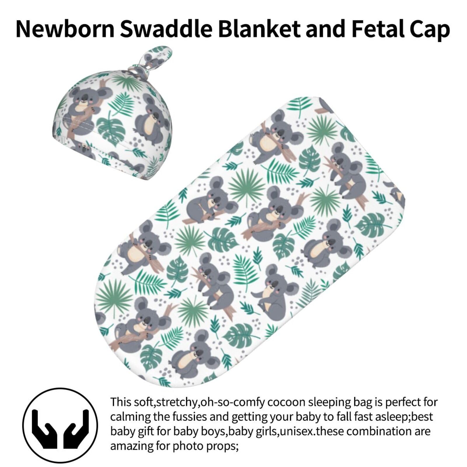 SIZE : Swaddle blanket is 11.4*20.8 in, Newborn hat is 6.5*13 in. This Koala swaddle blanket is suitable for babies aged 0-6 months. It is a meaningful gift for every baby welcome party. and also a perfect newborn photo prop, photography outfit, baby gift