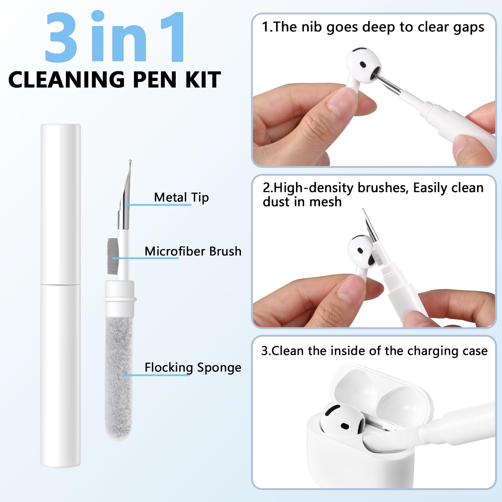 【3 in 1 Cleaning Pen】:This for airpods 4 case comes with a 3-in-1 cleaning pen that allows you to easily maintain your earbuds. This versatile tool features a soft brush, a fine tip, and a cleaning sponge to ensure that every corner, from the case to the earbud mesh, stays dust-free and spotless. Keep your Pods looking and performing like new