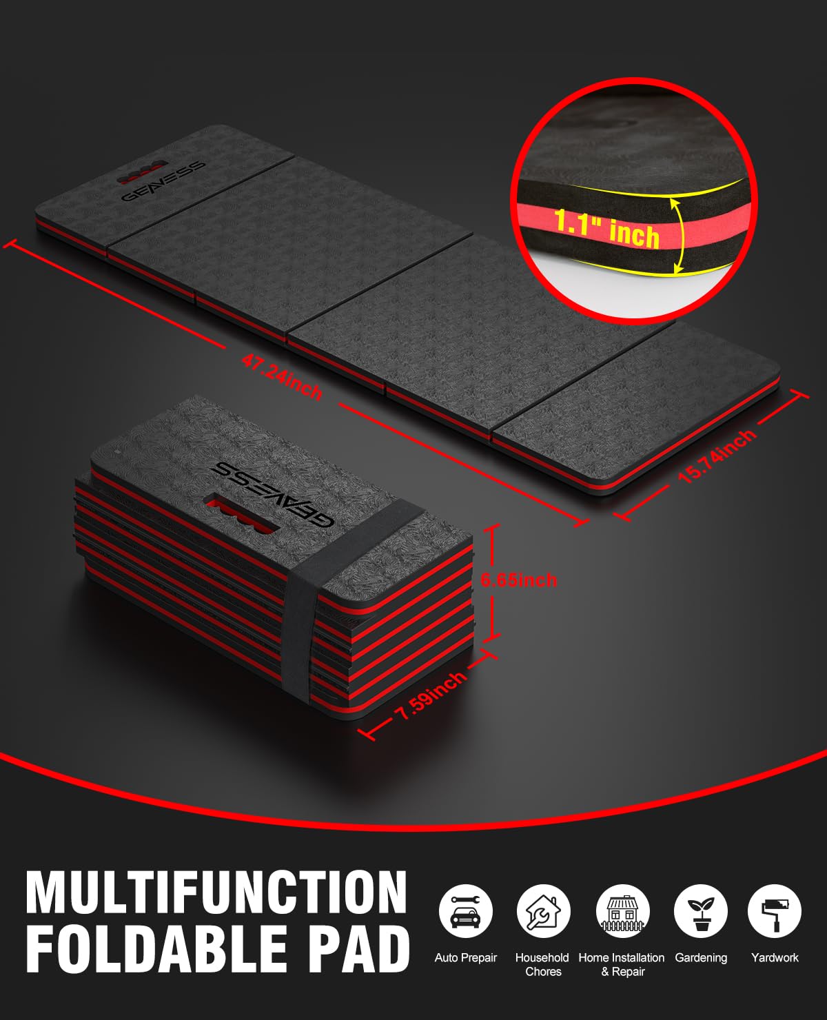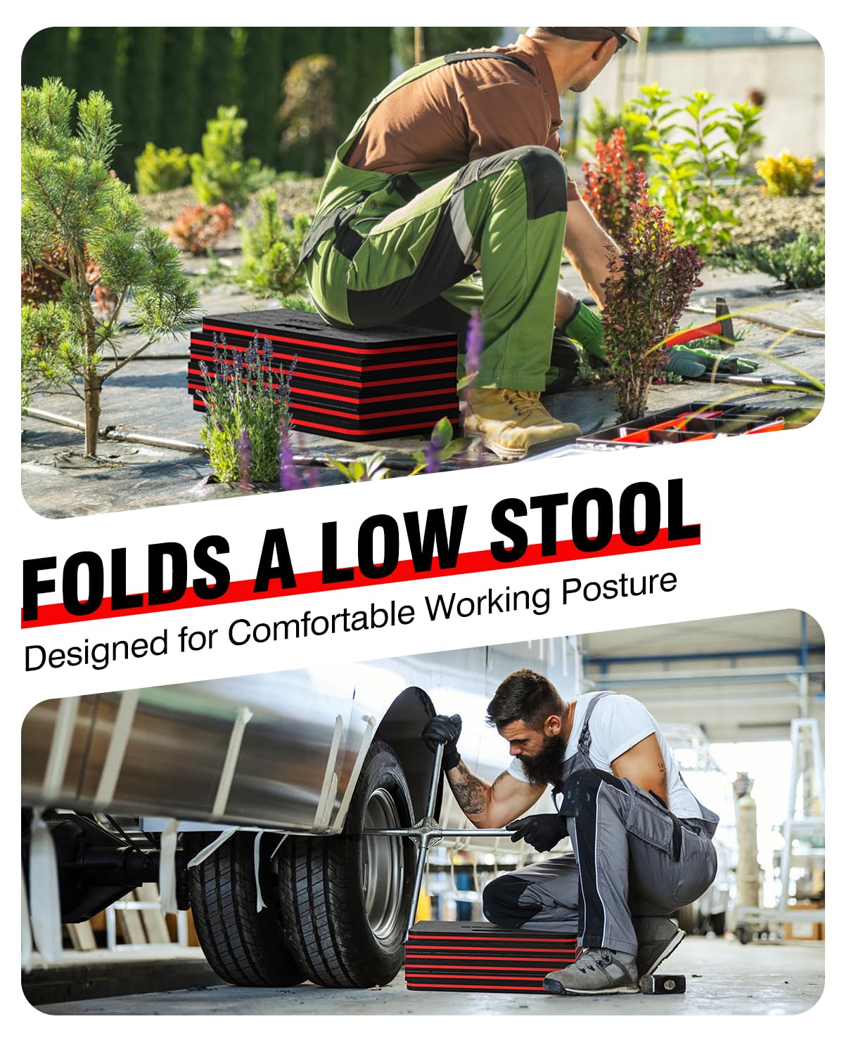 ✅ 【Extra-Large Foldable Pad for Multi-Scene Use】 Unfold to 47.2"×15.7"×1.1"—fits 1 person lying (car repairs) or 2 kneeling (gardening), shields you from hard concrete, rough garden soil, or dirty garage floors. Folds compact to 15.74"×7.59"×6.65" to double as a low stool. Ideal for garage repairs, backyard gardening & household cleaning.