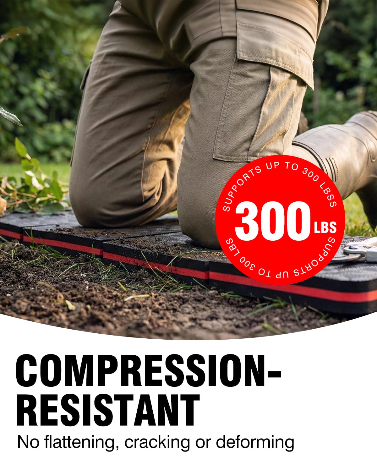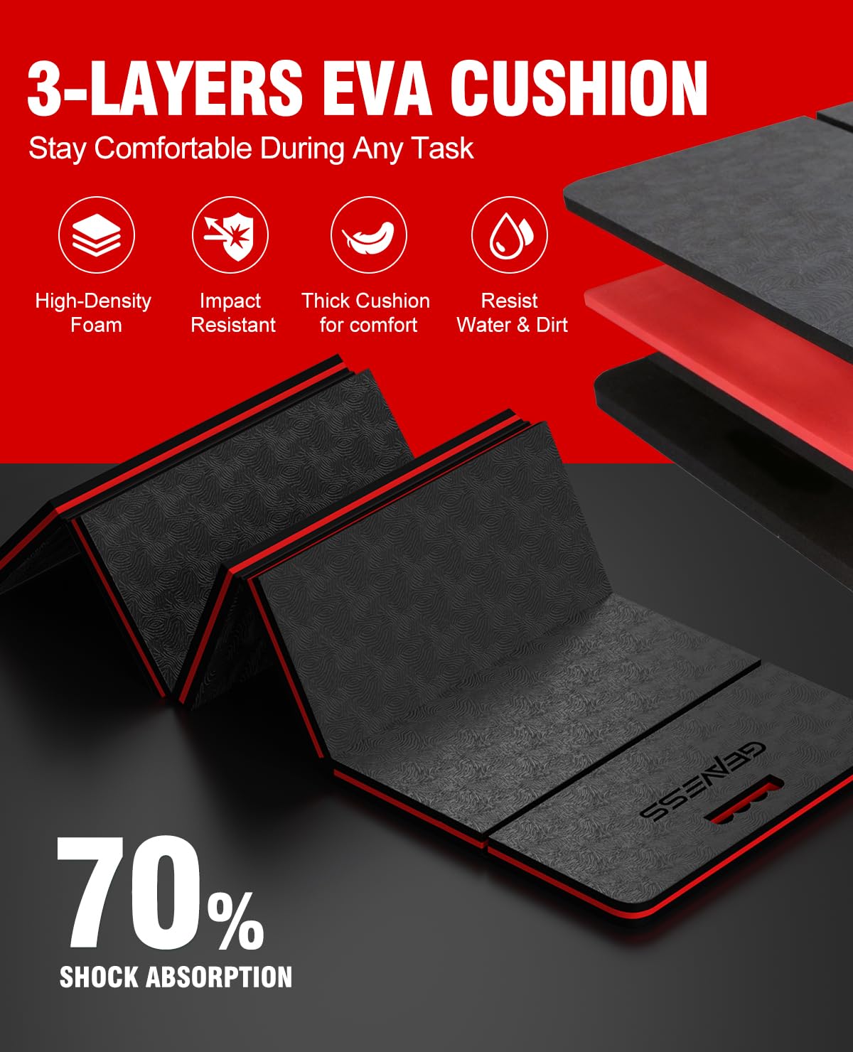 ✅ 【70% Knee Pressure Relief - Durable Compression Resistance】 1.1-inch thick 3-layer high-density EVA closed-cell foam cushions, shields knees from concrete, soil & sharp debris. No flattening, cracking or deforming—stays supportive season after season. Suitable for gardening kneeling or full-body comfort during car repairs.