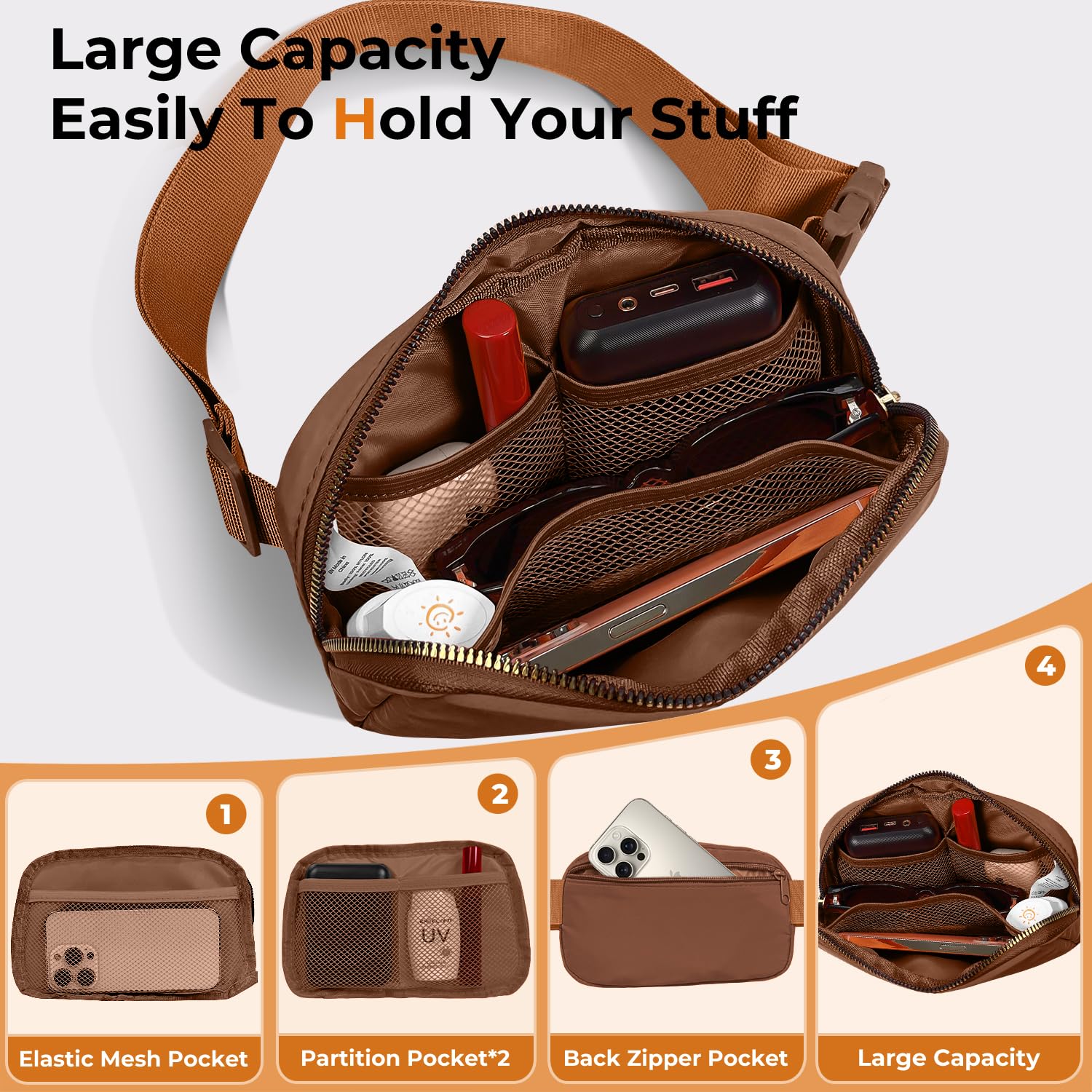 HADNS-FREE & SPACIOUS STORAGE: The Everywhere Belt Bag Fanny Pack Wear as Crossbody, Shoulder Bag,or Waist Pack. Trusted by Active Lifestyles,Features 5 Secure Compartments(1 main+3 mesh+1 hidden pocket)to organize phones, wallets, keys, and travel docs