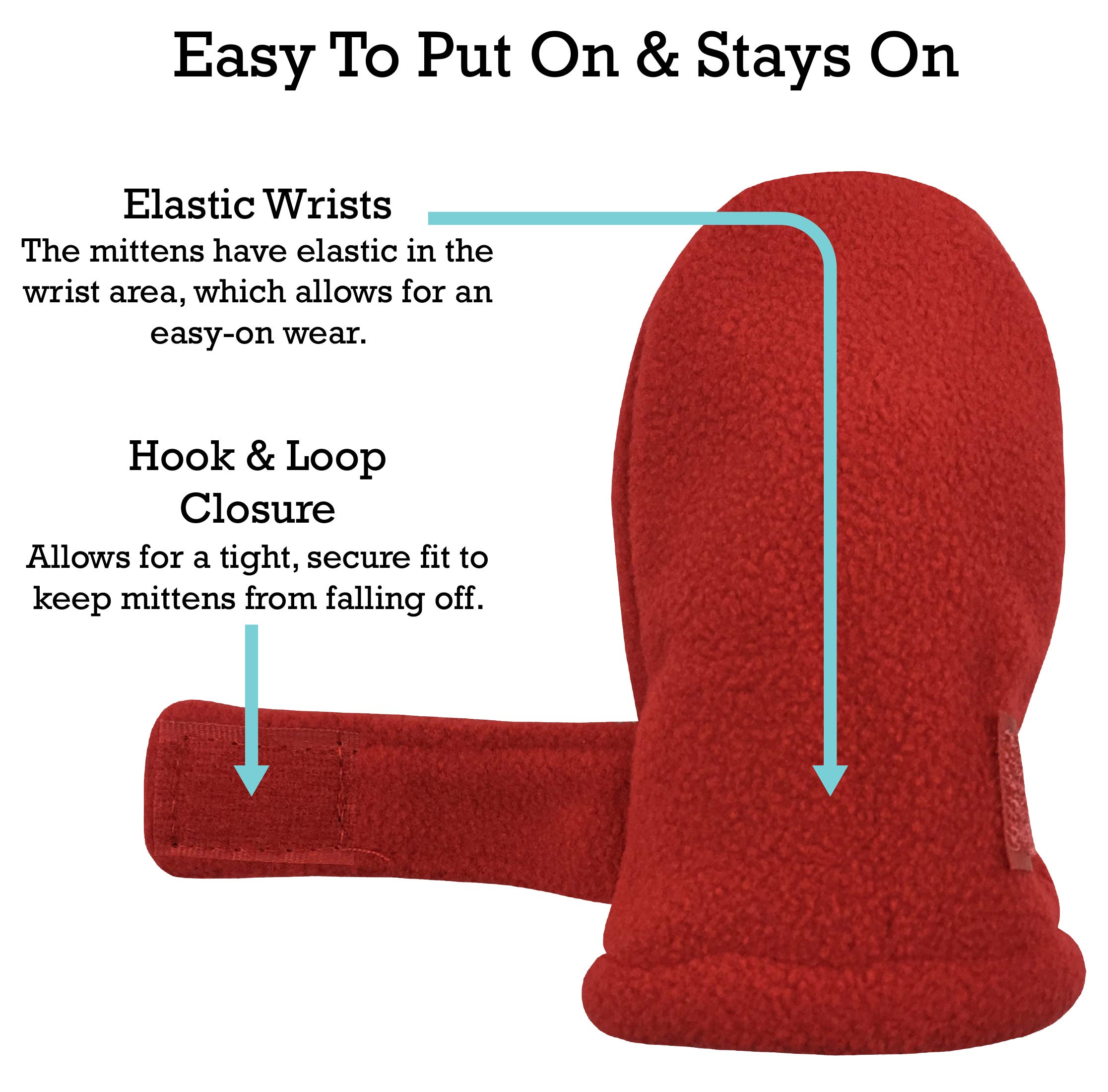 BABY & TODDLER GLOVES THAT ARE EASY TO PUT ON: The infant and child mittens are designed with elastic in the wrist area, which widens and allows for an easy-on fit. The hook and loop closure allows for a tight and secure fit