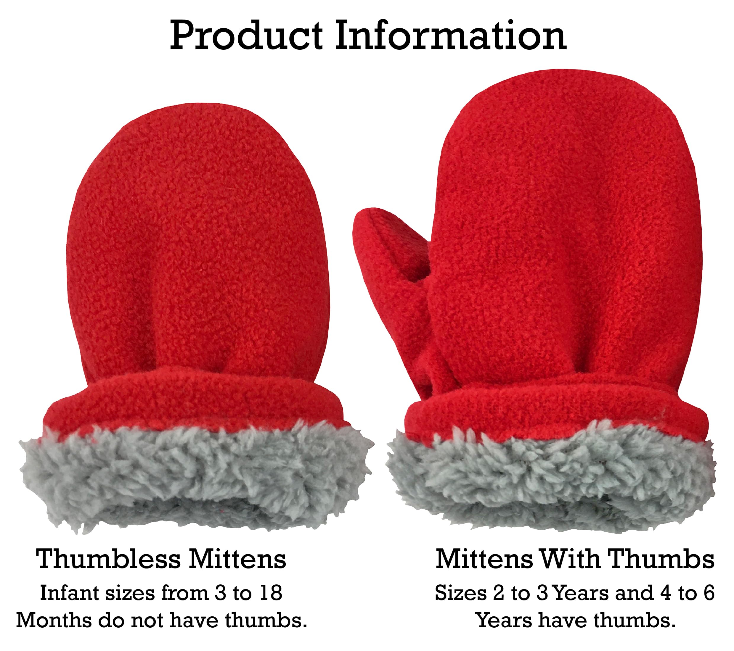 BOYS, GIRLS AND INFANT SIZING INFORMATION: For the baby sizes of 3-6 months and 6-18 months, the mittens do not have thumbs (they are thumbless). For the toddler and child sizes of 2-3 years and 4-6 years, the mittens have thumbs