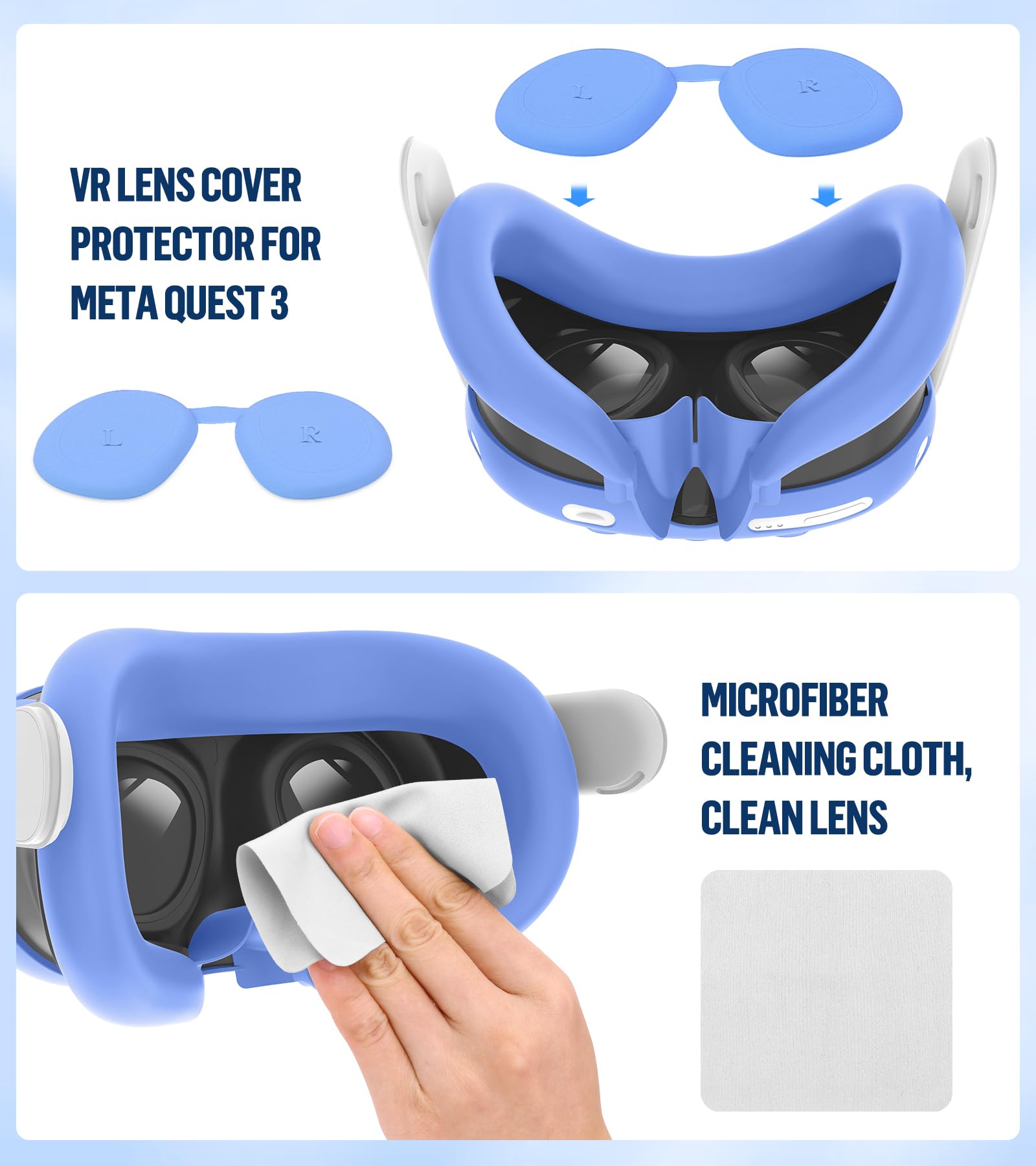 【Full Set VR Accessroies Silicone Cover for Meta Quest 3 Accessories】Incleuded 1x VR Silicone Face Cover, 1x VR Headset Shell Cover, 2 x Controller Grip Cover, 3 x Lens Tempered Glass Protector, 1x Lens Camera Protector, 2x Joysticks Cover, 1 x Cleaning cloth. Ensuring full protection for your Oculus Quest 3.