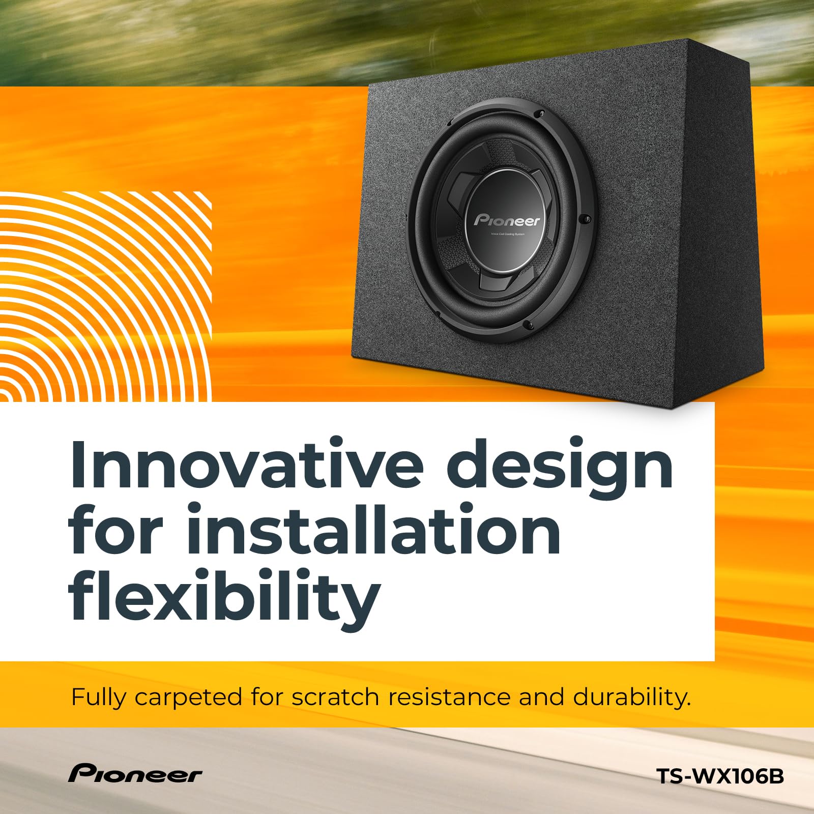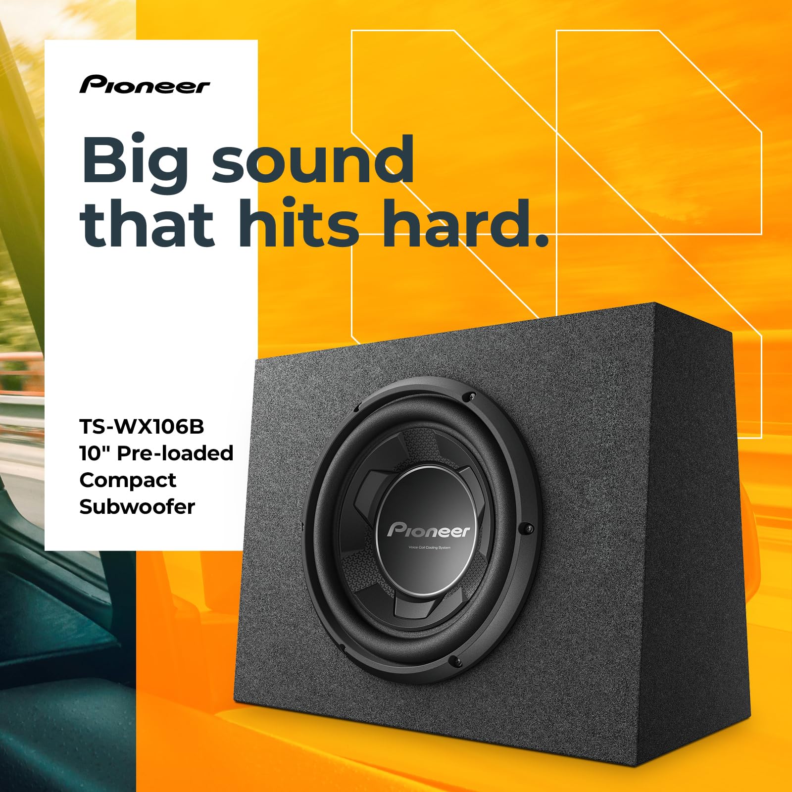 Discover the power of the Pioneer TS-WX106B, our small but mighty 10" compact subwoofer speaker, designed for superior audio performance. Featuring a lightweight polymide tweeter diaphragm and a uniquely shaped wave guide, this system ensures clear vocals and wide dispersion for natural sound delivery. Enhance your car stereo audio experience by connecting to an external amplifier, leveraging the 4Ω Single Voice Coil (SVC) design for straightforward wiring and reliable performance. The Voice Coil Cooling System (VCCS) maintains optimal temperatures during high-volume use, preserving sound quality and extending durability. Its trapezoid shape reduces internal standing waves, increases rigidity, and offers flexible installation options under seats or in cabins, with choices for rear, front, or upward firing configurations. Fully carpeted for scratch resistance and durability, the TS-WX106B guarantees non-slip performance in any setup. Upgrade your car speaker system today, and enjoy the deep, rich bass the Pioneer TS-WX106B has to offer.
