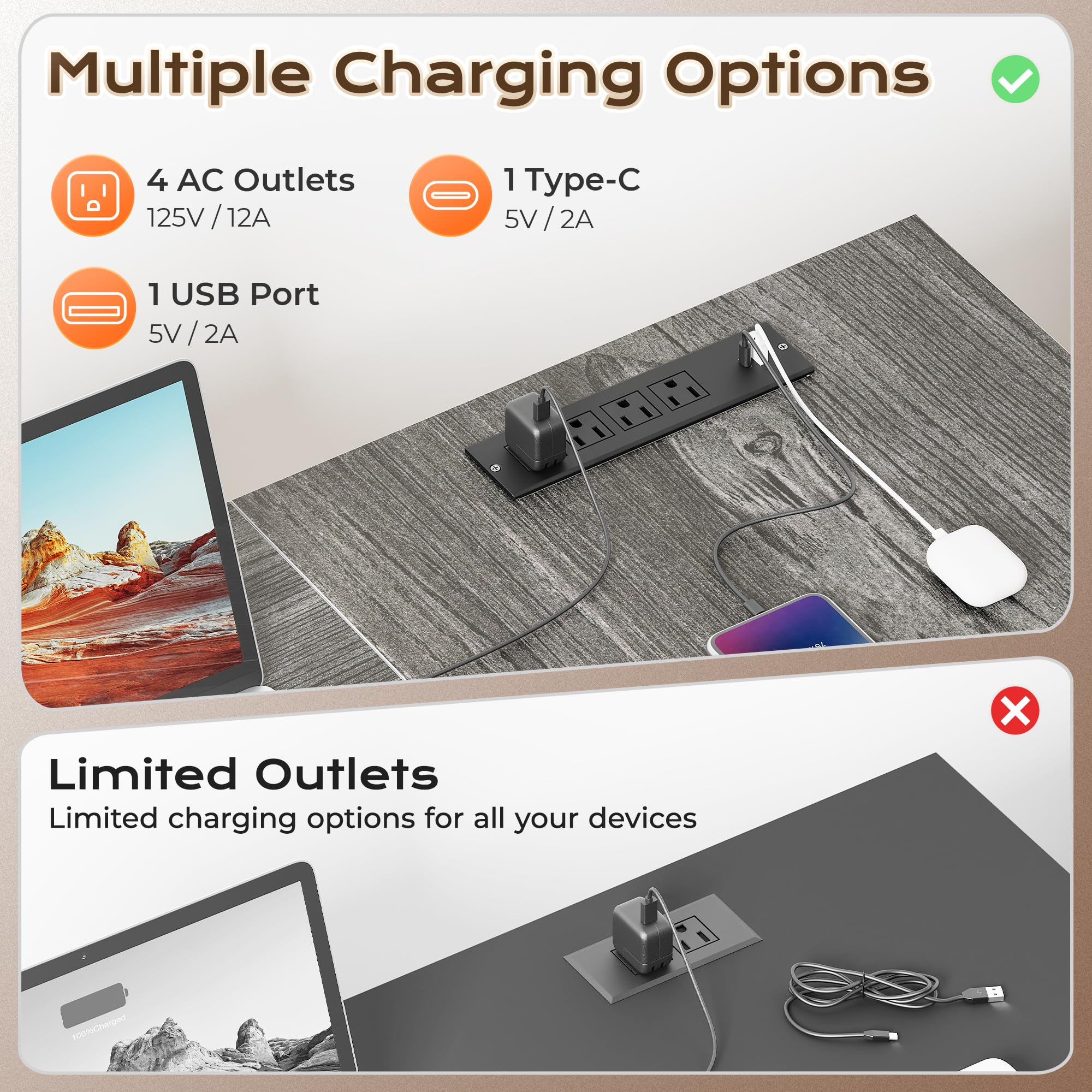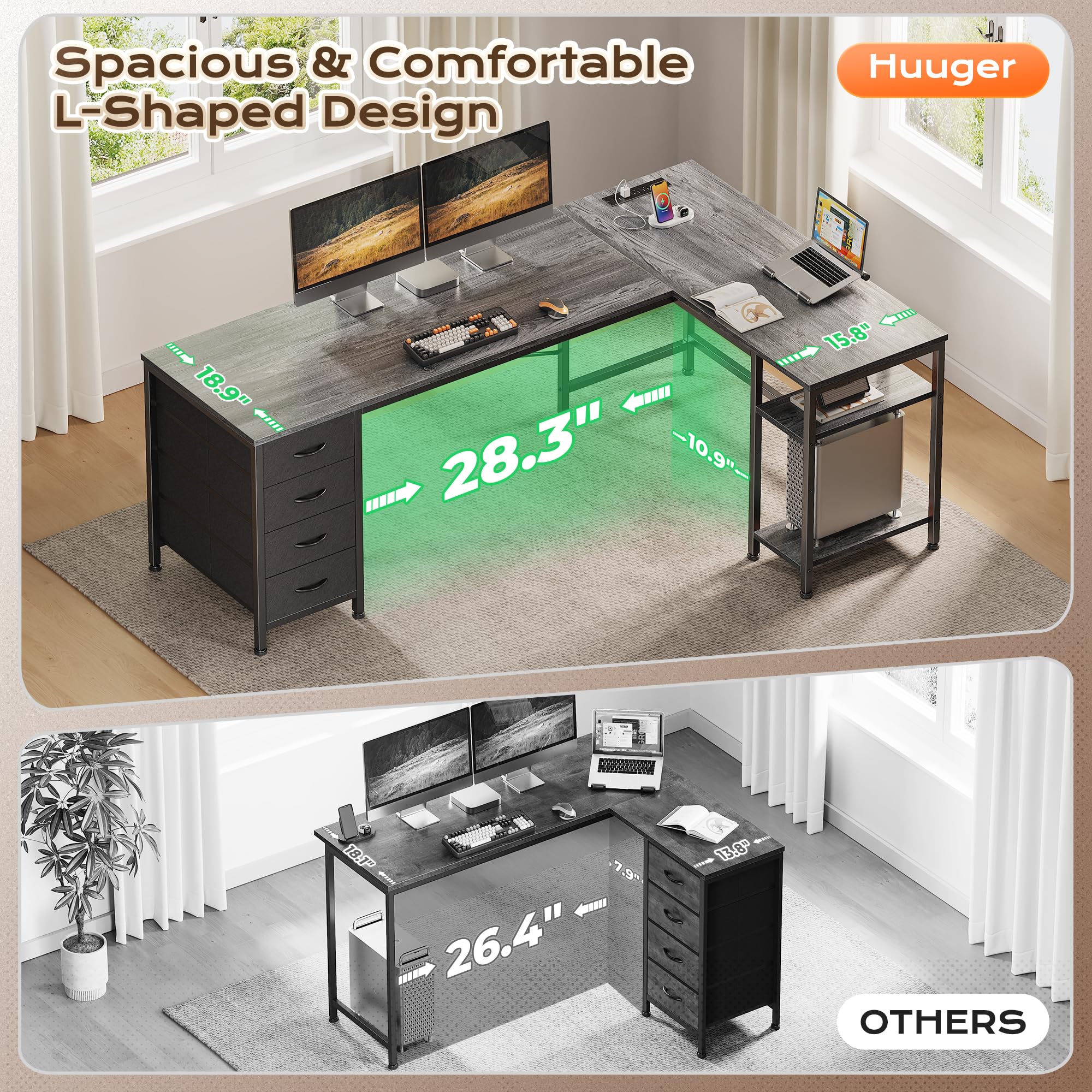 【L Shaped Desk with Power Outlet】Built-in power outlet with 4 AC outlets, 1 USB port, and 1 USB-C port on the l shaped desk with drawers keeps your laptop, phone, tablet, desk lamp, and even a Bluetooth speaker all powered up, no more messy extension cords or crawling under the office desk