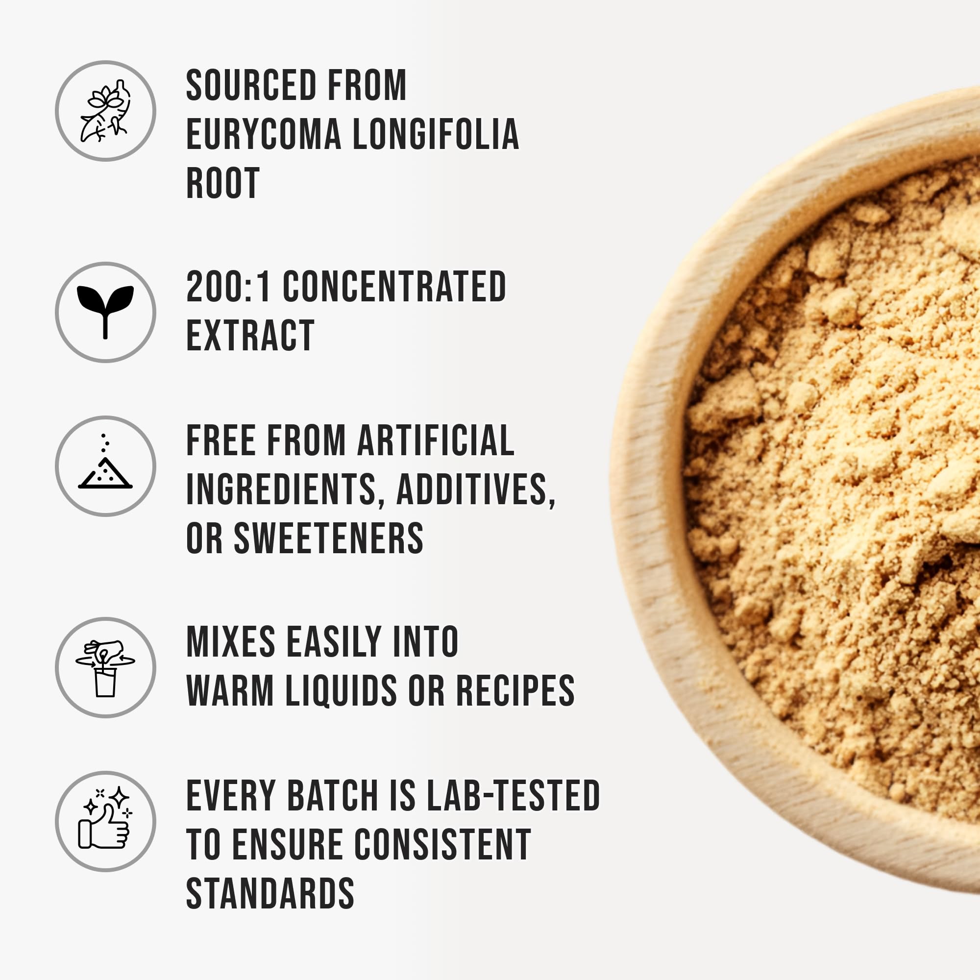 Pure Tongkat Ali Supplement: We've crafted our Longjack powder to be a premium source of Eurycoma longifolia root extract, brimming with all the natural goodness you need. It has no fillers or GMOs for a clean experience that aligns with your health.