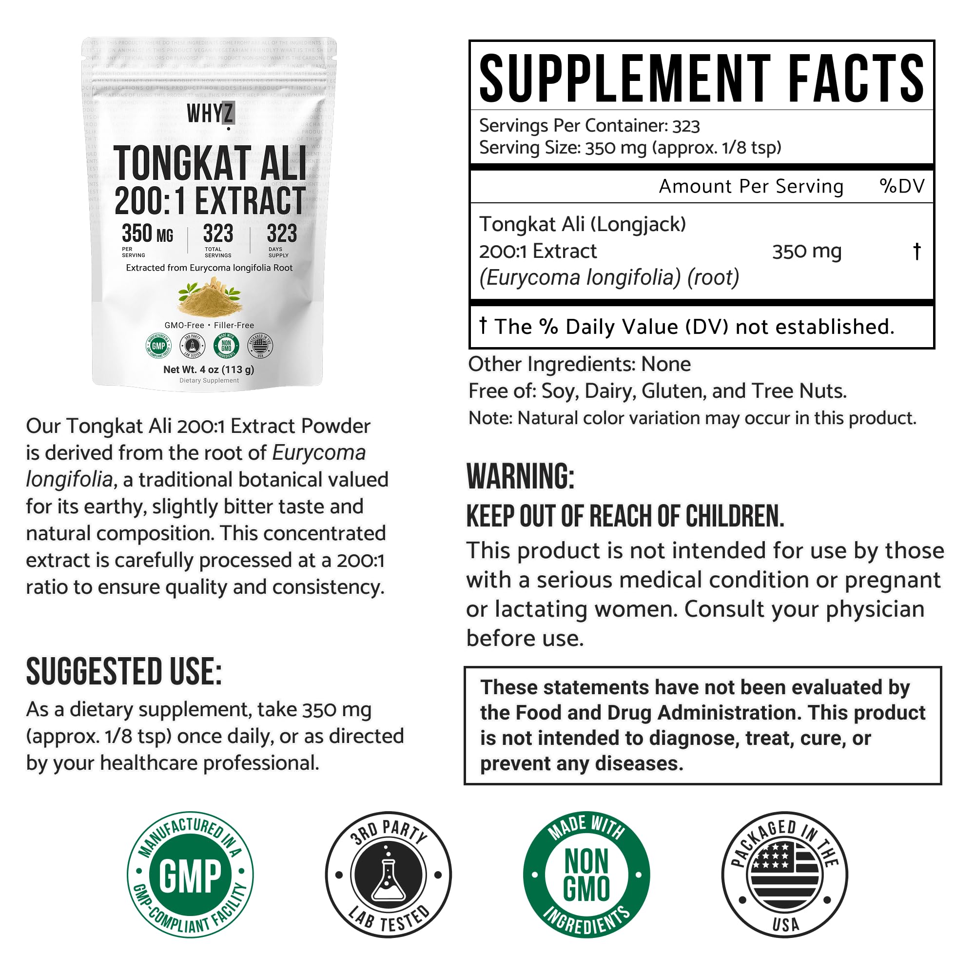 How to Use: Our tongkat ali longjack Extract formula is well-known for its ability to deliver only the benefits you desire. Take 350 mg of our tongkat ali root extract once daily, or mix it into your favorite shakes, smoothies, or beverages of choice.