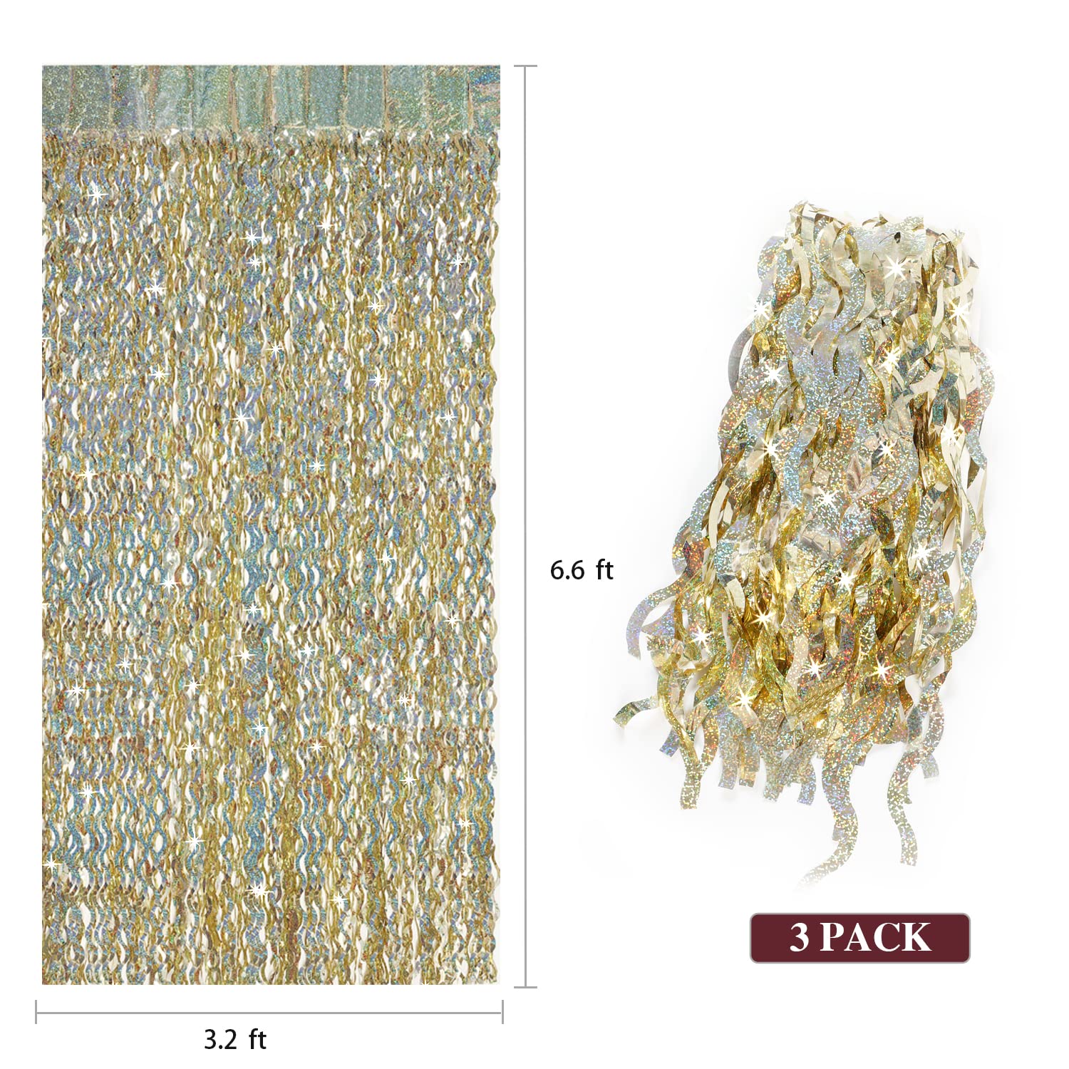 Packing Included: 3 pack champagne gold tinsel foil fringe curtains party photo backdrop, Each pack curtains size is 3.3ft x 6.6ft, enough length for decorate your party