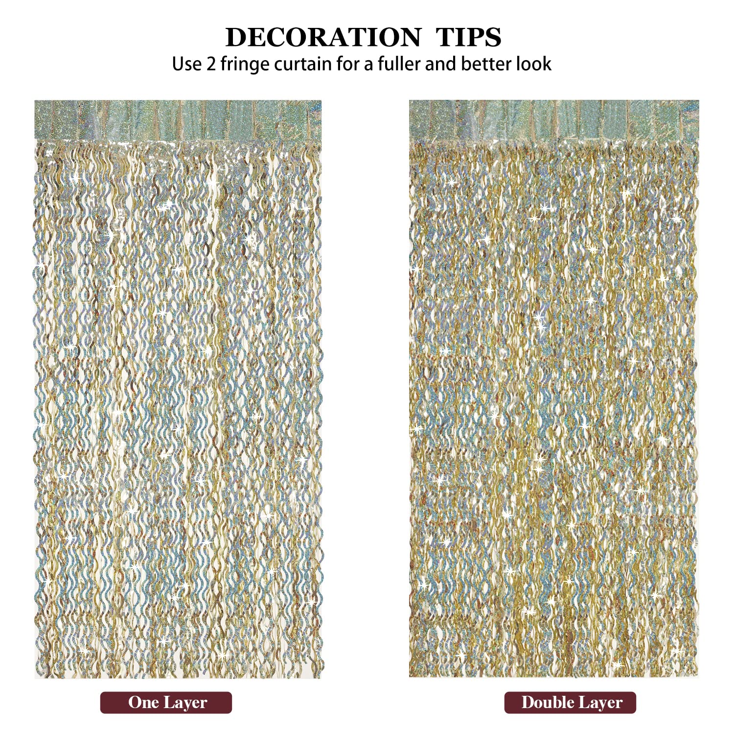 TIPS: 1 You also can use your own tapes to make the fringe stick sturdy 2 You can cut the tinsel by scissors into the suitable length and width for your party use 3pcs of the curtains side by side to make the backdrop larger, or layer the 2 pack curtains to achieve a thicker and denser effect