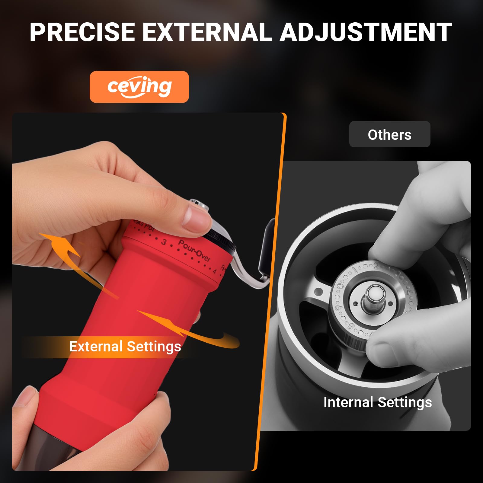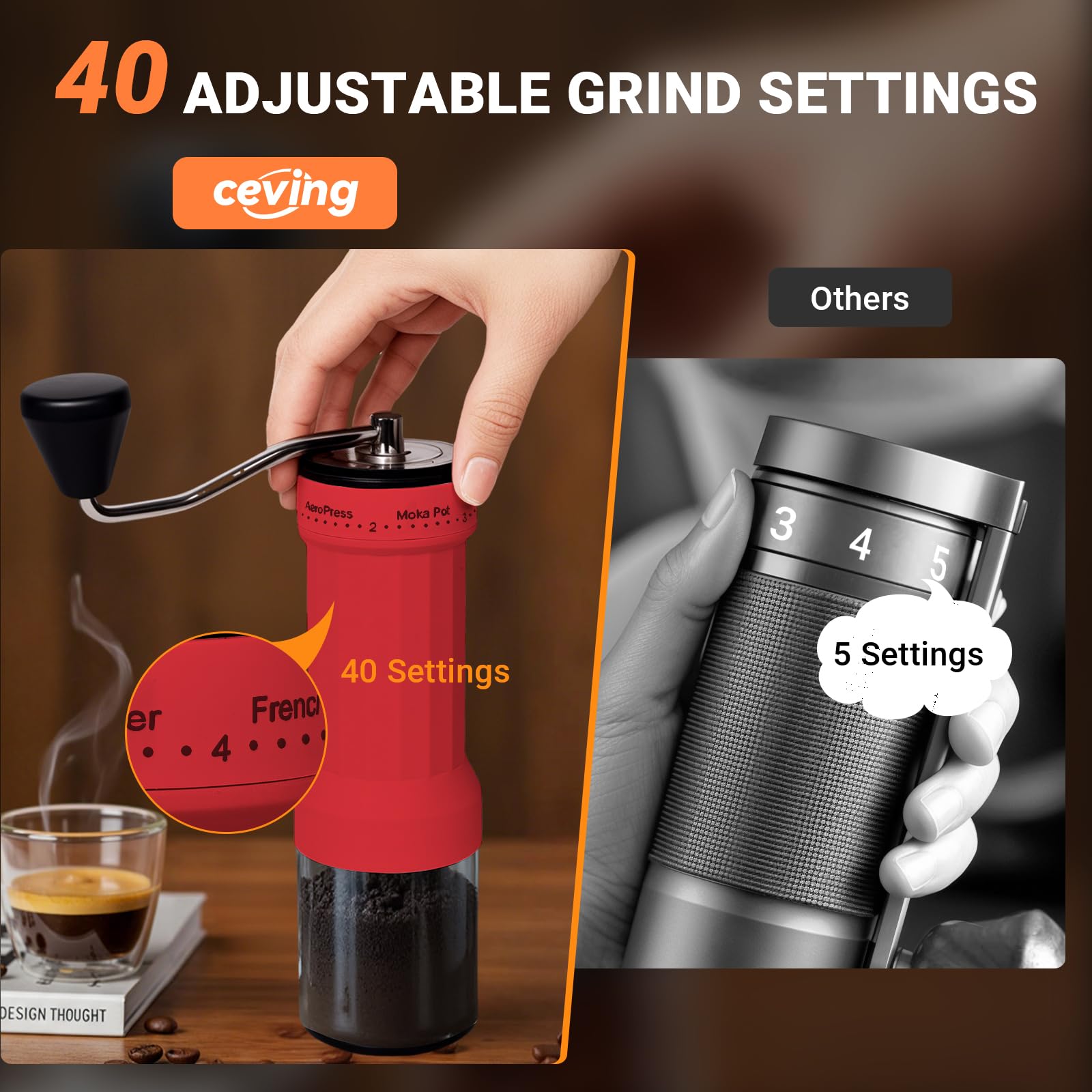 40 EXTERNAL ADJUSTABLE GRIND SETTINGS – Unlike traditional grinders with hidden internal adjustments, our manual coffee mill features 40 precise external settings for effortless fine-tuning. Simply turn the dial to switch from espresso-fine to French press-coarse—no guesswork, no messy spills. Enjoy full control over your grind for richer flavor in every cup!