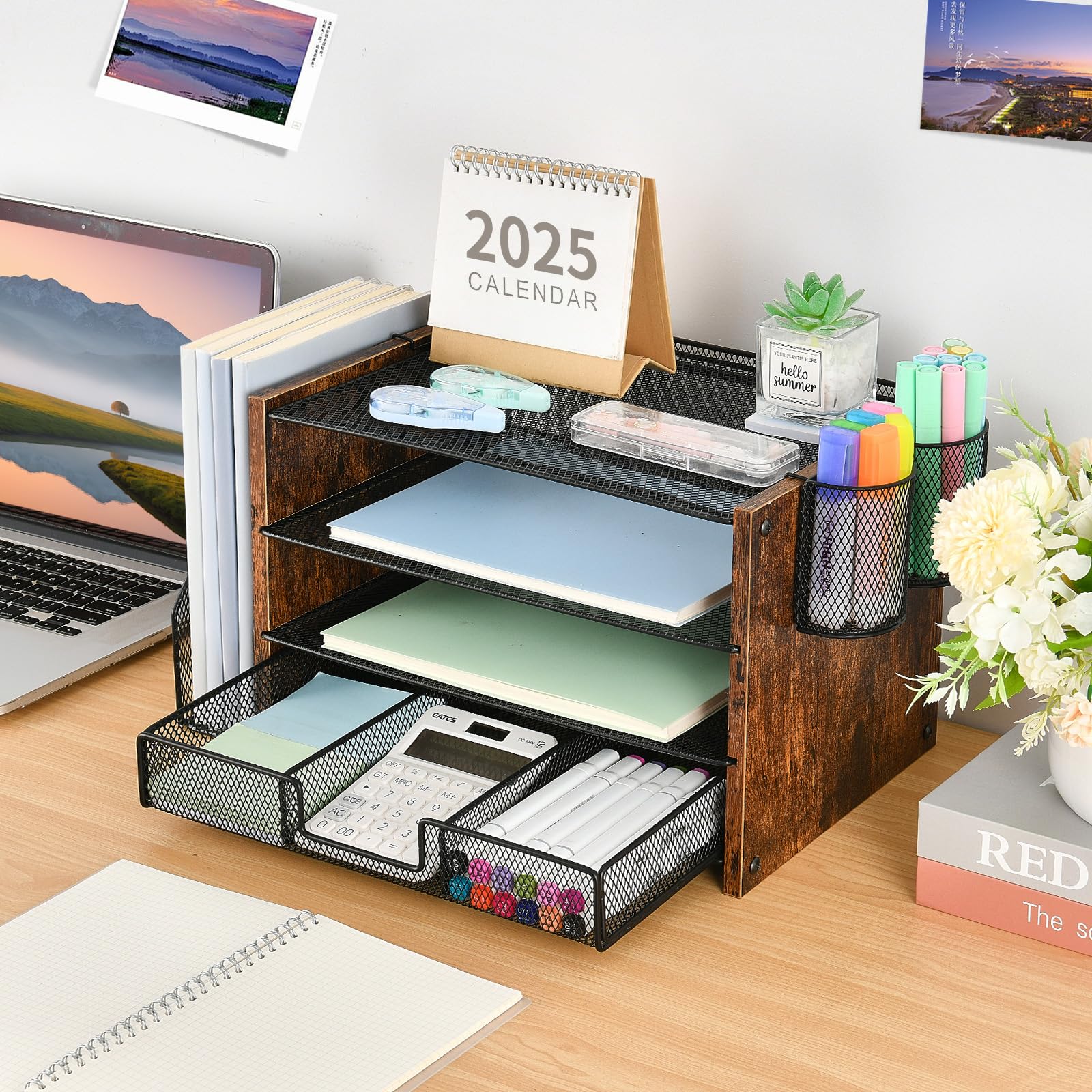 đăMulti-Functional Office OrganizationăGet your work area in order with the OPNICE Desk Organizer! Featuring 4 spacious trays, a vertical file organizer, 2 convenient hanging pen holders, and a sliding drawer, you can store all your office supplies, classify and organize them, and keep your desktop tidy