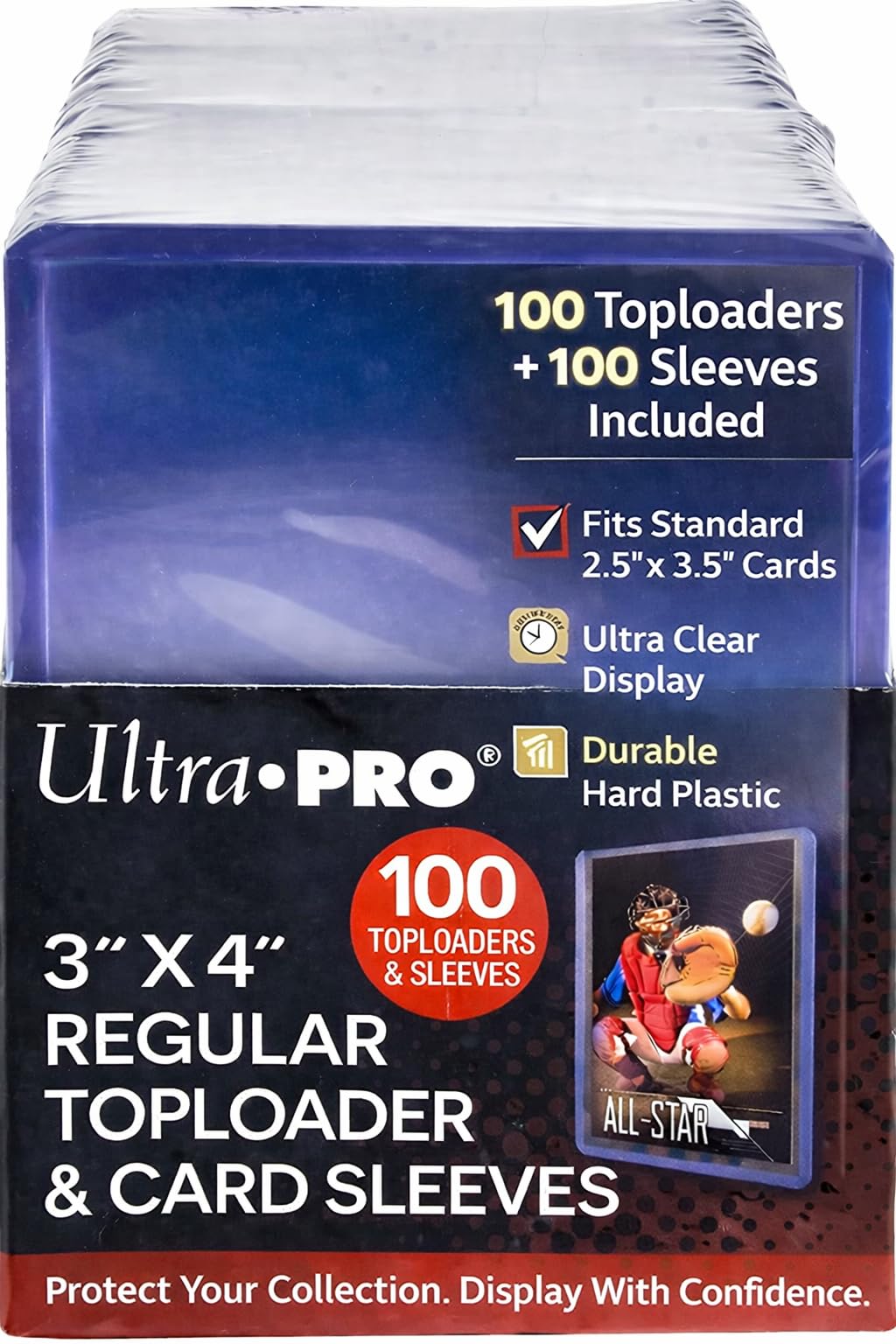 Protect your valuable collectible trading cards with the original Ultra PRO Toploaders and soft sleeves! This bundle combines both Toploaders and card protector sleeves together in one convenient package to make your collecting hobby a breeze. Ultra PRO's Toploaders are rigid plastic card sleeves made with super clear PVC to keep your cards safe for storage, display, during trade, and in shipments. With outer dimensions of 3" x 4", these Toploaders are designed to safely store standard size cards (2-1/2" x 3-1/2") up to 35 points in thickness. Ultra PRO's clear soft sleeves are made with non-PVC, archival safe, and acid-free polypropylene film. These sleeves minimize surface scratches and damage to your cards during storage, display, or, for gaming cards, during gameplay. For the best protection of your cards, combine with Ultra PRO Toploaders to achieve acid-free inner layer protection with rigid structural integrity in the outer layer. This bundle includes 100 individual Toploaders (same quality as item 3" x 4" Clear Regular Toploaders) and 100 individual clear soft sleeves (same quality as item 2.5" x 3.5" Soft Trading Card Penny Sleeves). Protect your valuable collectible trading cards with the original Ultra PRO Toploaders and "penny sleeves" Both sleeves and Toploaders are sized to hold 2-1/2" x 3-1/2" (63.5mm x 88.9mm) standard size cards up to 35 points in thickness Toploaders are made with super clear, rigid PVC plastic while soft sleeves are made with archival-safe, non-PVC polypropylene clear film Each pack comes with 100 individual Toploaders and 100 individual soft sleeves plastic sleeves for cards, toploaders for cards, baseball card holders hard plastic, toploaders for cards 1000 count, plastic card protector, trading card toploaders, pokemon toploaders, hard sleeves for cards, pokemon card protector sleeves, thick card sleeves, baseball cards sleeves, card sleves, ultra pro toploaders, pokemon card hard sleeves, sports card toploaders,
