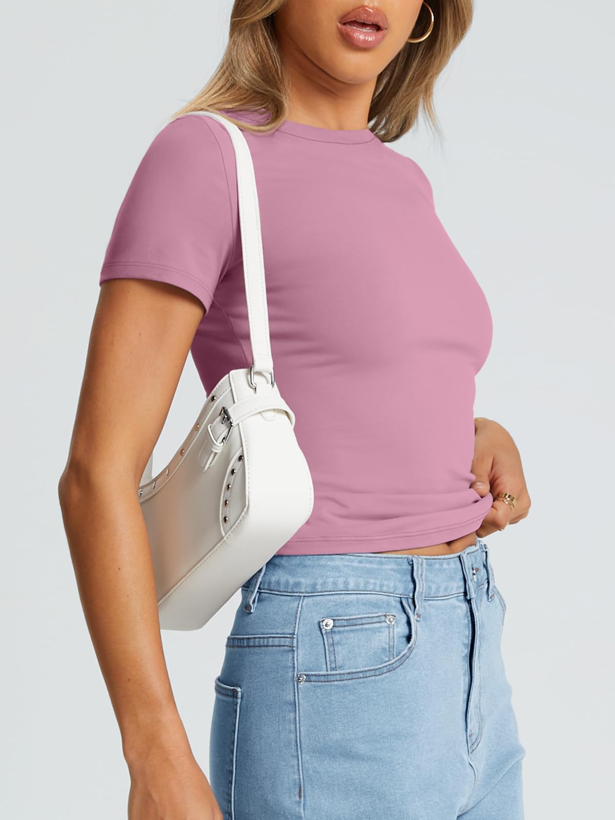 Design: This top features a cute, slim-fitted, and casual style with a crew neck and short sleeves. It comes in both cropped and regular styles, giving you the option to wear it as a regular top or fold it up for a trendy crop top look