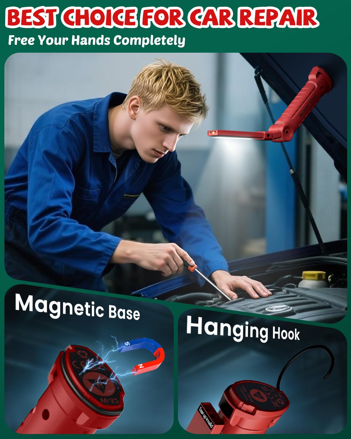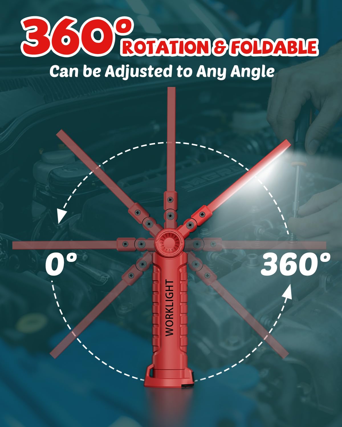 Sturdy and Portable: This led work light is made of hard rubber, anti-sweat and anti-slip, the head is aluminum which dissipates the heat effectively, prolong the life of the lamp. Thanks to the foldable design, the lamp is easy to carry, and save storage space