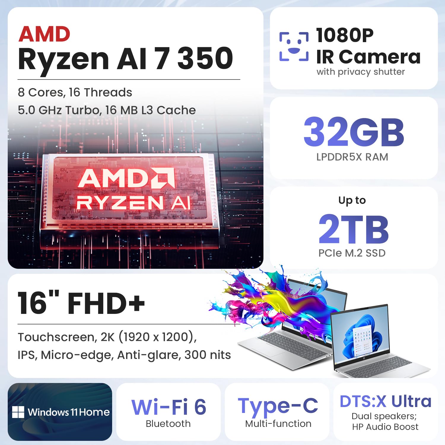 Key Features and Benefits: CPU: AMD Ryzen AI 7 350 Processor (8 Cores, 16 Threadss, 16 MB L3 Cache, Base Frequency at 2.0 GHz, Up to 5.0 GHz at Max Turbo Frequency) Memory: 32GB LPDDR5X-5600MHz RAM Hard Drive: Up to 2TB PCIe M.2 Solid State Drive Operating System: Windows 11 Home Display: 16-inch, FHD+ (1920 x 1200) Touchscreen, 60 Hz, IPS, Micro-edge, Anti-glare, 300 nits Brightness, 62.5% sRGB Graphics: AMD Radeon Graphics Bundle Product: Bundle with ADATA SD620-512GCBK External Mobile SSD Ports: 1x USB Type-A(10Gbps) 1x USB Type-A(5Gbps) 2x USB Type-C(10Gbps) 1 x Headphone/Microphone Combo Jack 1x HDMI-out/p> Wireless Connectivity: Wi-Fi 6 + Bluetooth Webcam: HP True Vision 1080p FHD IR Camera with privacy shutter Keyboard: Full-size Backlit Keyboard(On: F4) Optical Drive: None Dimensions: 14.08 x 10.03 x 0.73 inches Weight: 3.97 lbs Color: Sliver