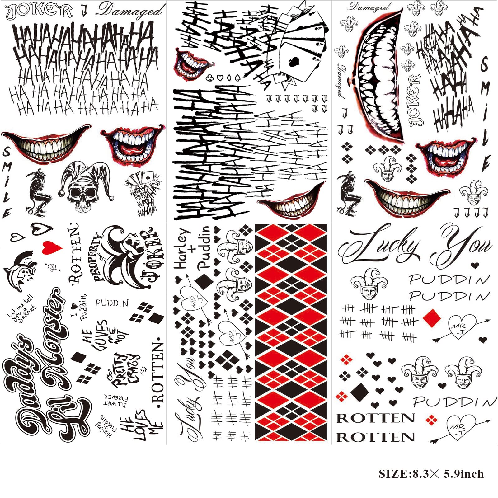 About Product: Package Include: 22 sheets Halloween Joker temporary tattoos Size: 6 sheets Joker tattoos 8.3'' * 5.9'', 16 sheets 4.1'' * 2.4''. High Quality: Our Joker temporary tattoos can last 5-7 days according to the position you stick it Easy to Remove: 10-20 seconds with just water and easily removed by rubbing alcohol, body oil, olive oil. How To Use: 1. Cut out tattoo of choice and remove the transparent film. 2. Place tattoo face down on skin. 3. Wet the tattoo thoroughly with a sponge or towel. 4. After 20-30 seconds, gently remove the back paper. 5. Allow tattoo to dry. Note: Not intended for children under 3 years. Discontinue use if irritation occurs. Do not put directly on eye. Do not apply to sensitive skin, near eyes, of if allergic to adhesive. Due to the difference between different monitors, the picture may not reflect the actual color of the item.