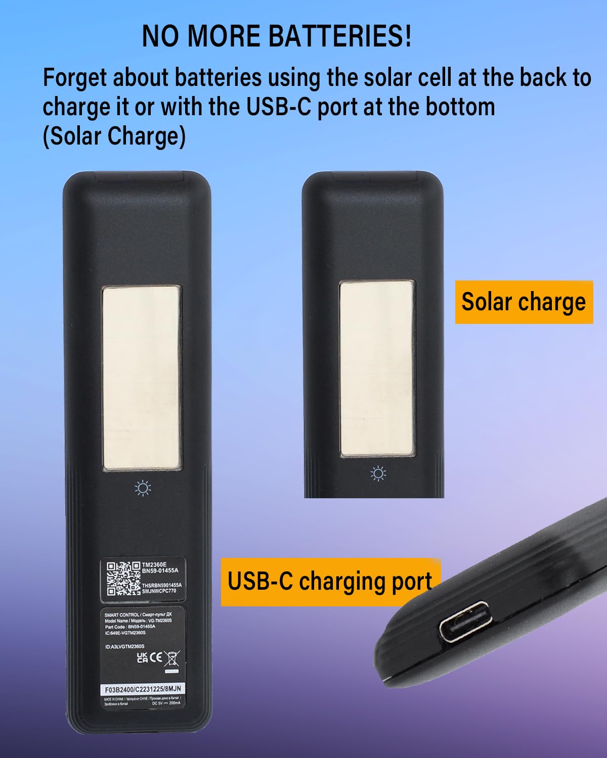 3.[Solar and USB Type-C interface charging] No battery - Our remote control uses high-end solar charging technology and supports USB charging without the trouble of replacing the battery. It's convenient and environmentally friendly