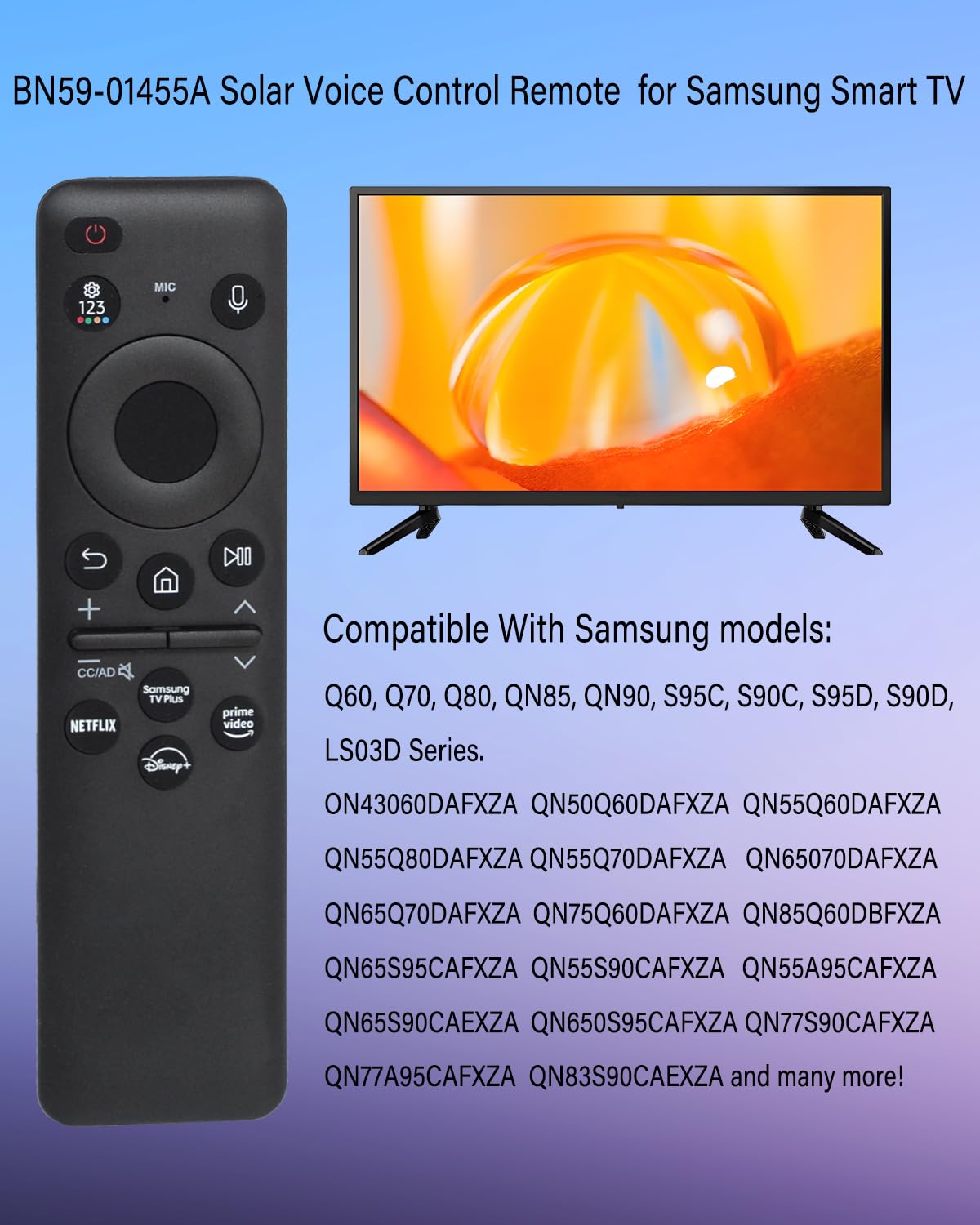 1.New BN59-01455A Solar Voice Remote compatible with Samsung NEO QLED Frame Crystal UHD OLED 4K Smart TVs and supports Tizen operating system.Shortcut Buttons: for Netflix,for Disney, for Prime Video, and for Samsung TV dedicated shortcut buttons.