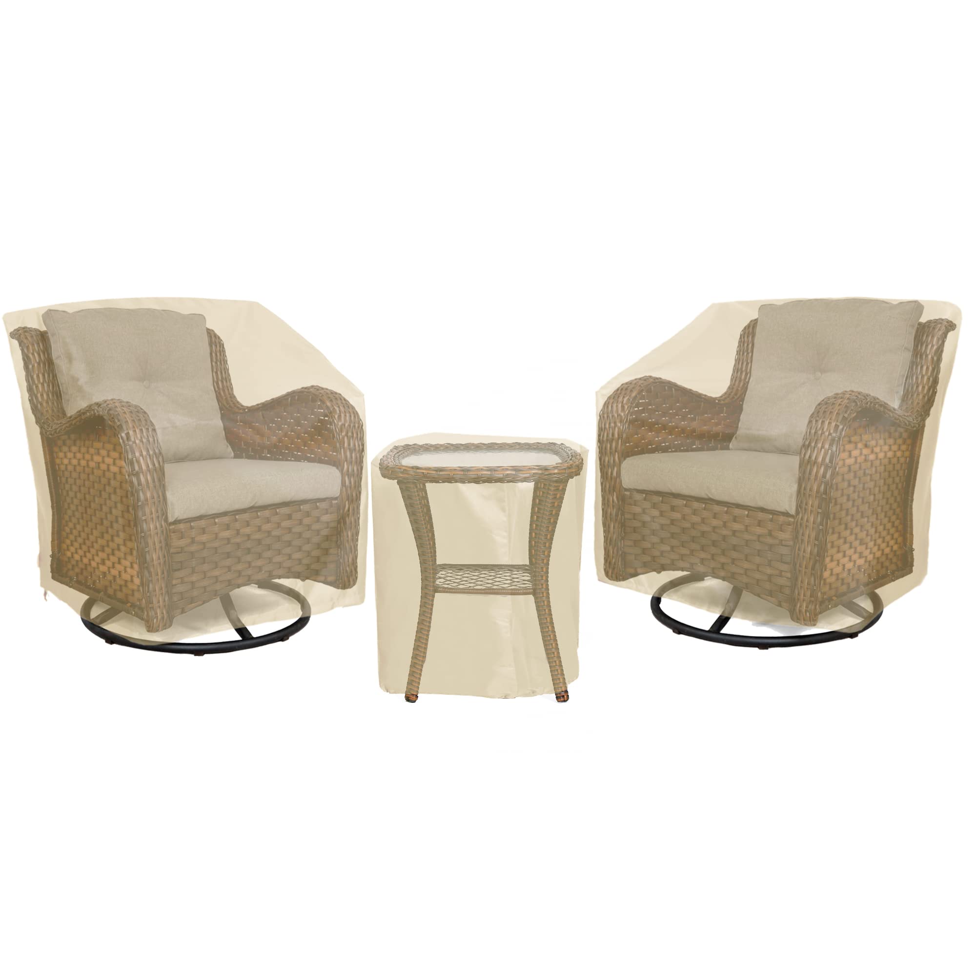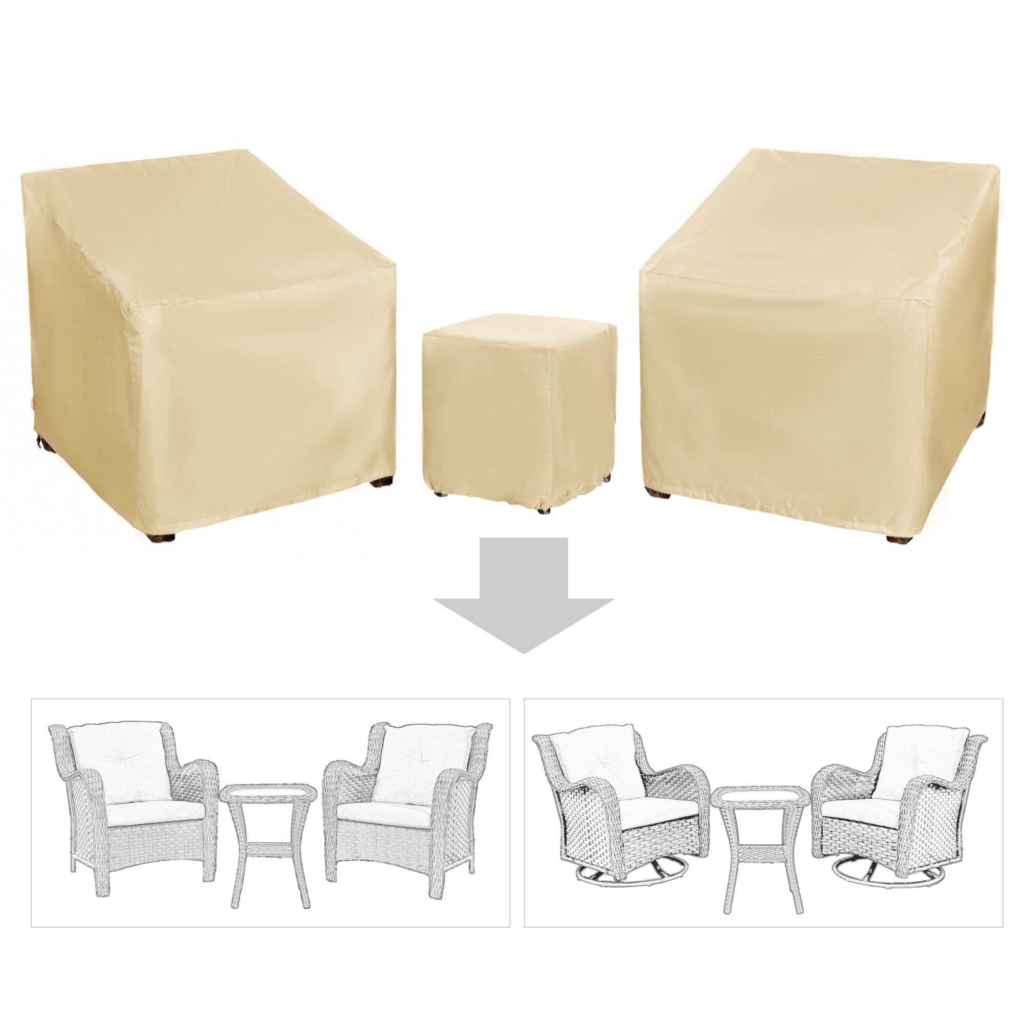 3 Pieces Patio Bistro Sets Cover: Protect your 3 piece patio bistro set with our all-weather furniture cover set, which includes 2 chair covers and 1 coffee table cover. It's suitable for your deck, porch, patio, lawn, garden, poolside, and other indoor and outdoor areas with outdoor leisure rattan wicker furniture