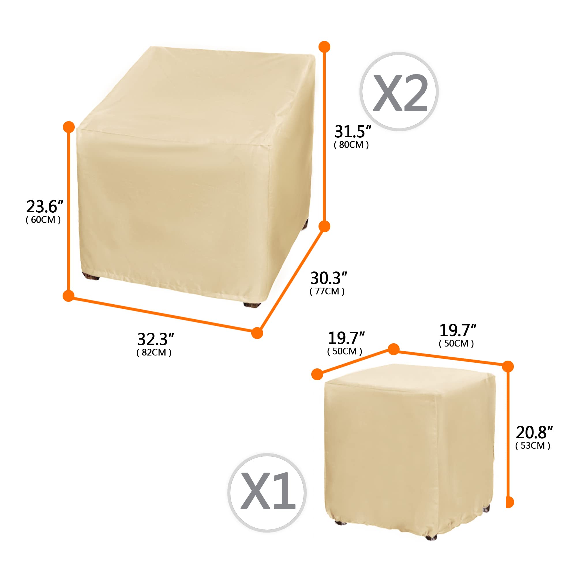 Cover Measurement: Ensure a perfect fit by measuring your patio furniture before purchasing. Our armchair cover fits up to 32.3" long x 30.3" deep x 31.5" high, and the coffee table cover is 19.7" long x 19.7" deep x 20.8" high. Coverage depends on the size of your furniture set, especially the depth of the chairs.Please measure the dimensions of your furniture carefully before purchasing