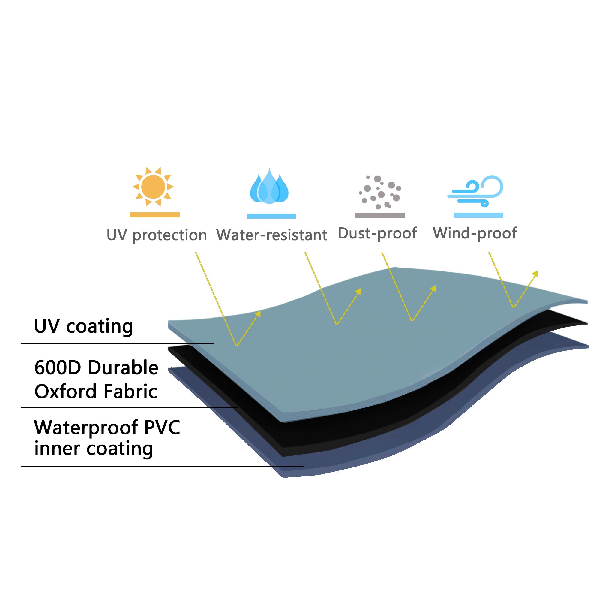 Waterproof and UV Resistant: Our patio furniture cover is made of heavy-duty 100% 600D Oxford Polyester fabric with a PVC waterproof undercoating that keeps rain and snow out, and a UV-resistant coating that prevents sun damage in the summer and winter. It also protects your furniture from dust, leaves, and bird droppings, keeping it clean and dry