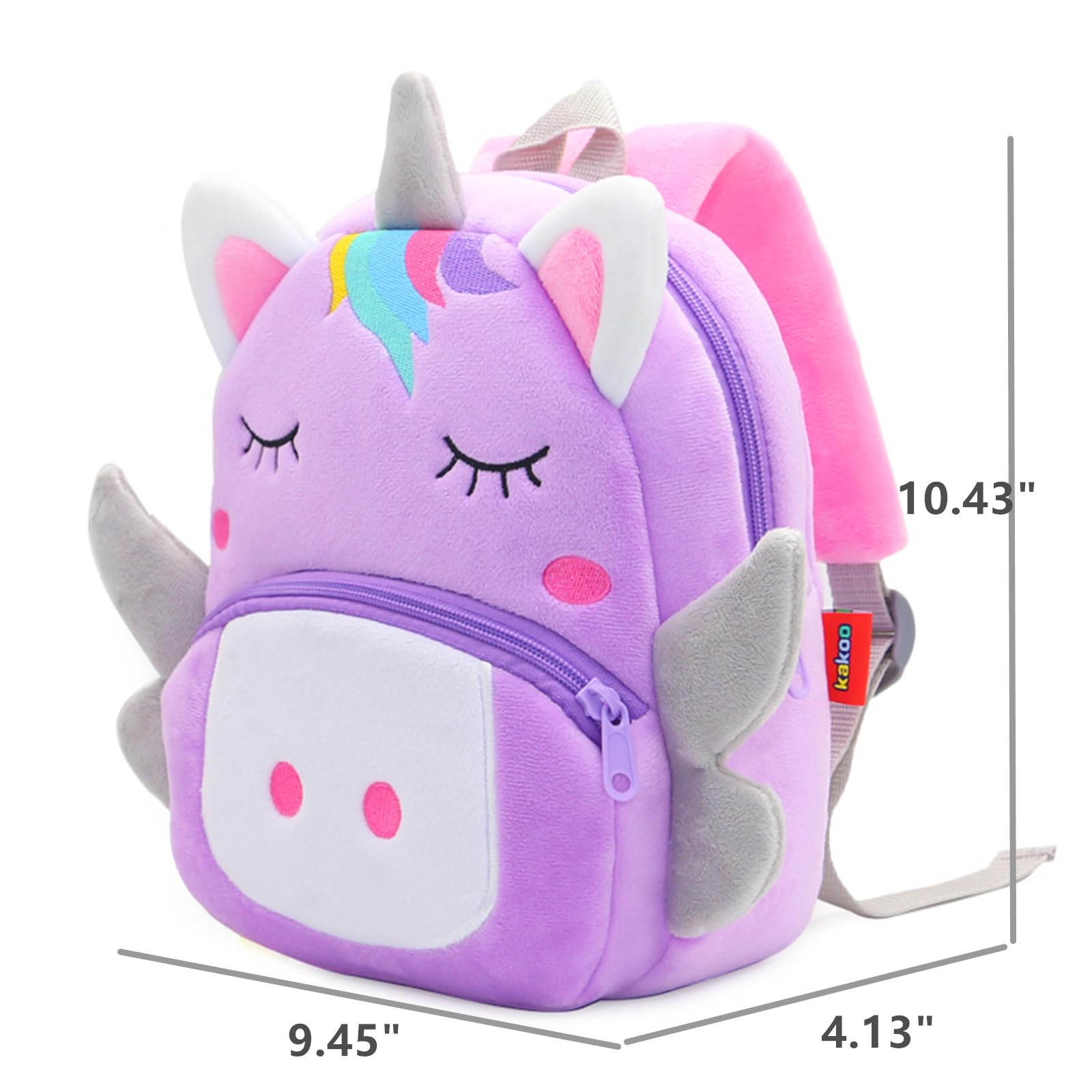 Demension : Our toddler backpack is 10.4"*4.1"*9.5"(26.5*24*10.5cm) in height* width*length.Fashionable, light-weight, soft and colorful. Perfect gift for baby toddler children