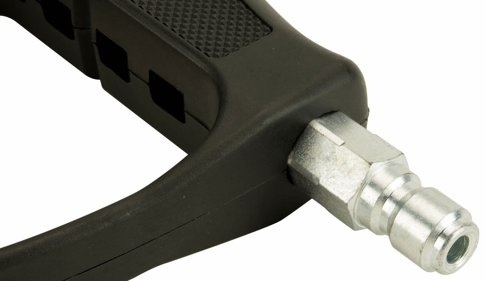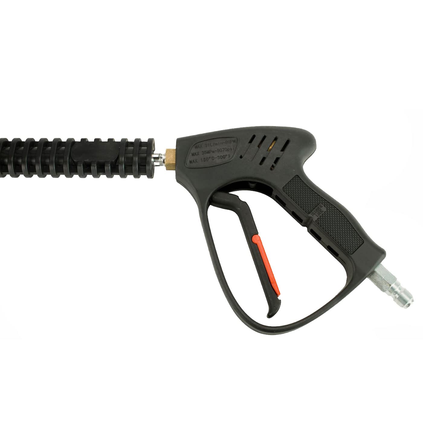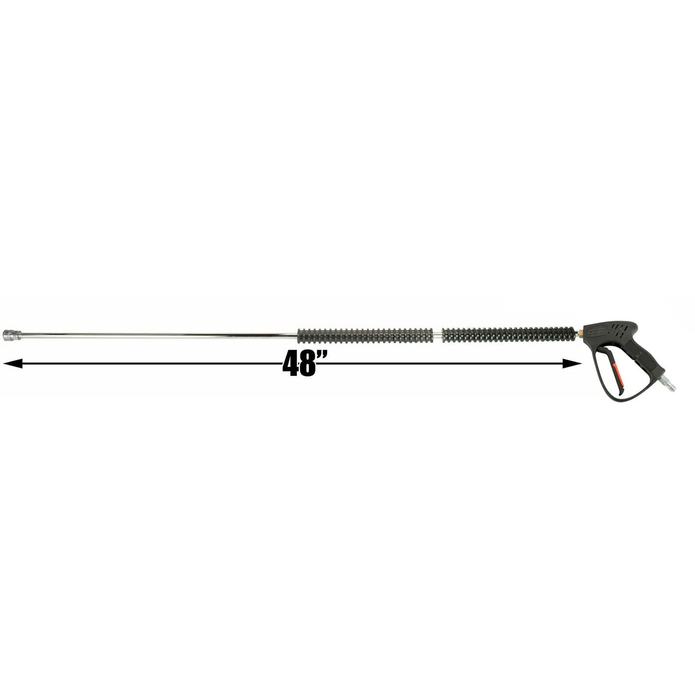 Erie Tools 5000 PSI 8 GPM Pressure Washer Gun and 48in. Wand 300° F Hot Water Grade with Trigger Lock 3/8in. QD Plug x 1/4in. NPT Easy Pull, Safety-off trigger lock, and brass internal parts Enables hose to enter pistol grip for easier handling Deluxe: Inlet: 3/8" Male Plug, Outlet: 1/4" female Maximums: 5000 PSI, 300° F, and 8 GPM Wands: 48" Wands: Inlet: 1/4" NPT-M, Outlet: 1/4" Quick Connect for Nozzles