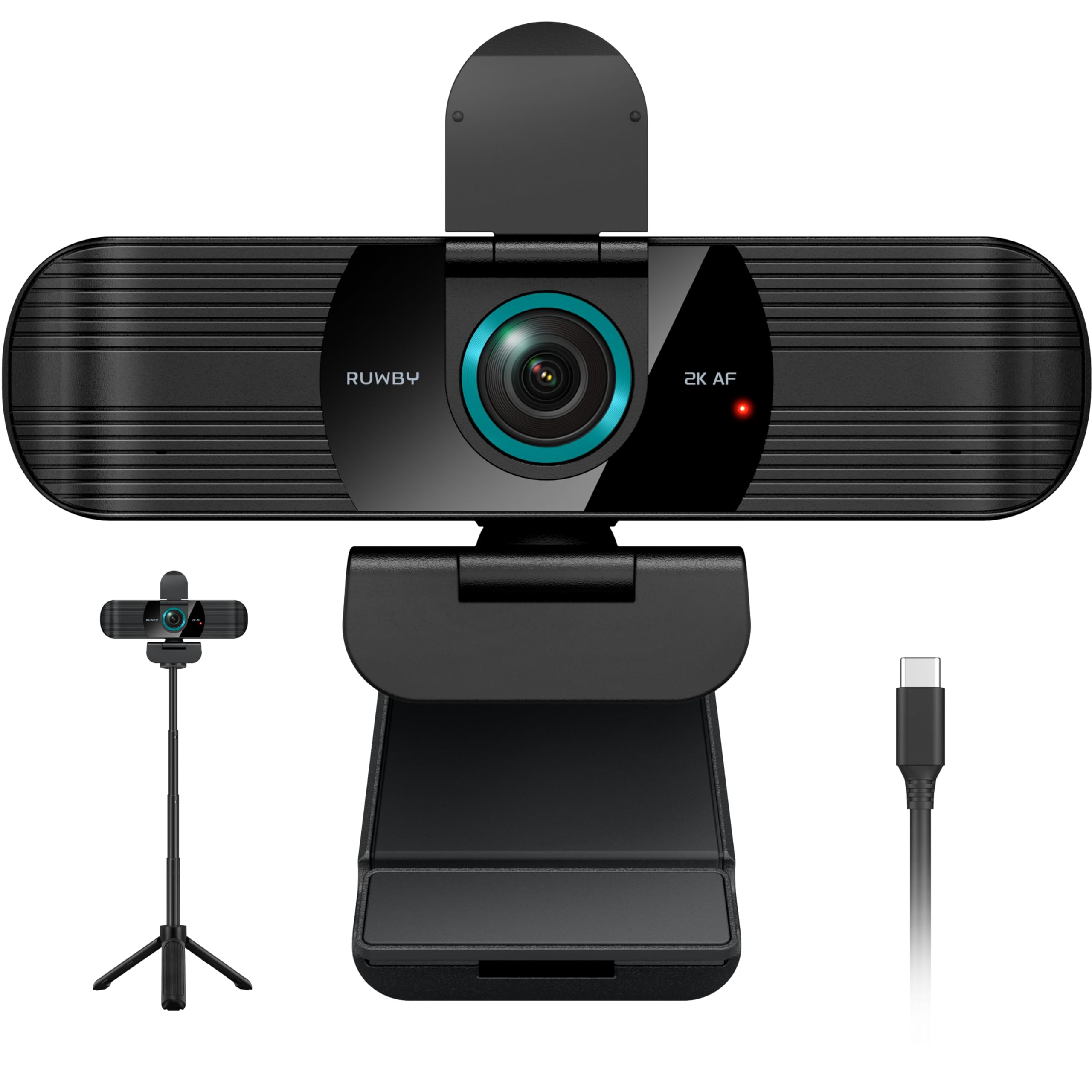 RUWBY QHD 2K Webcam with Built-in Dual Mics, Wide-Angle Lens, Privacy Cover, Tripod Stand, Autofocus PC Camera, Plug and Play for Desktop Computer or Laptop