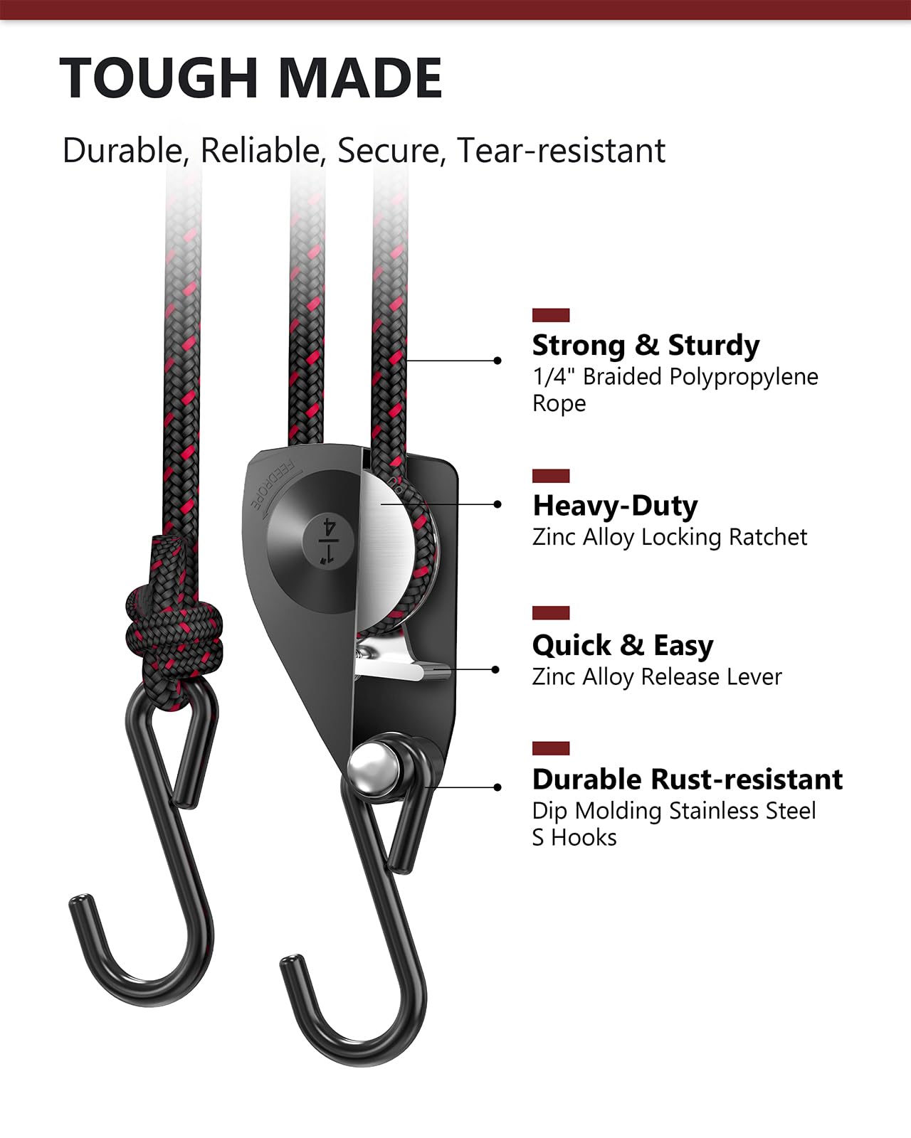 High-Quality Materials: The ratchet tie downs are made of solid braided polypropylene rope, reinforced with metal gears, and equipped with high-strength, rustproof stainless steel S hooks