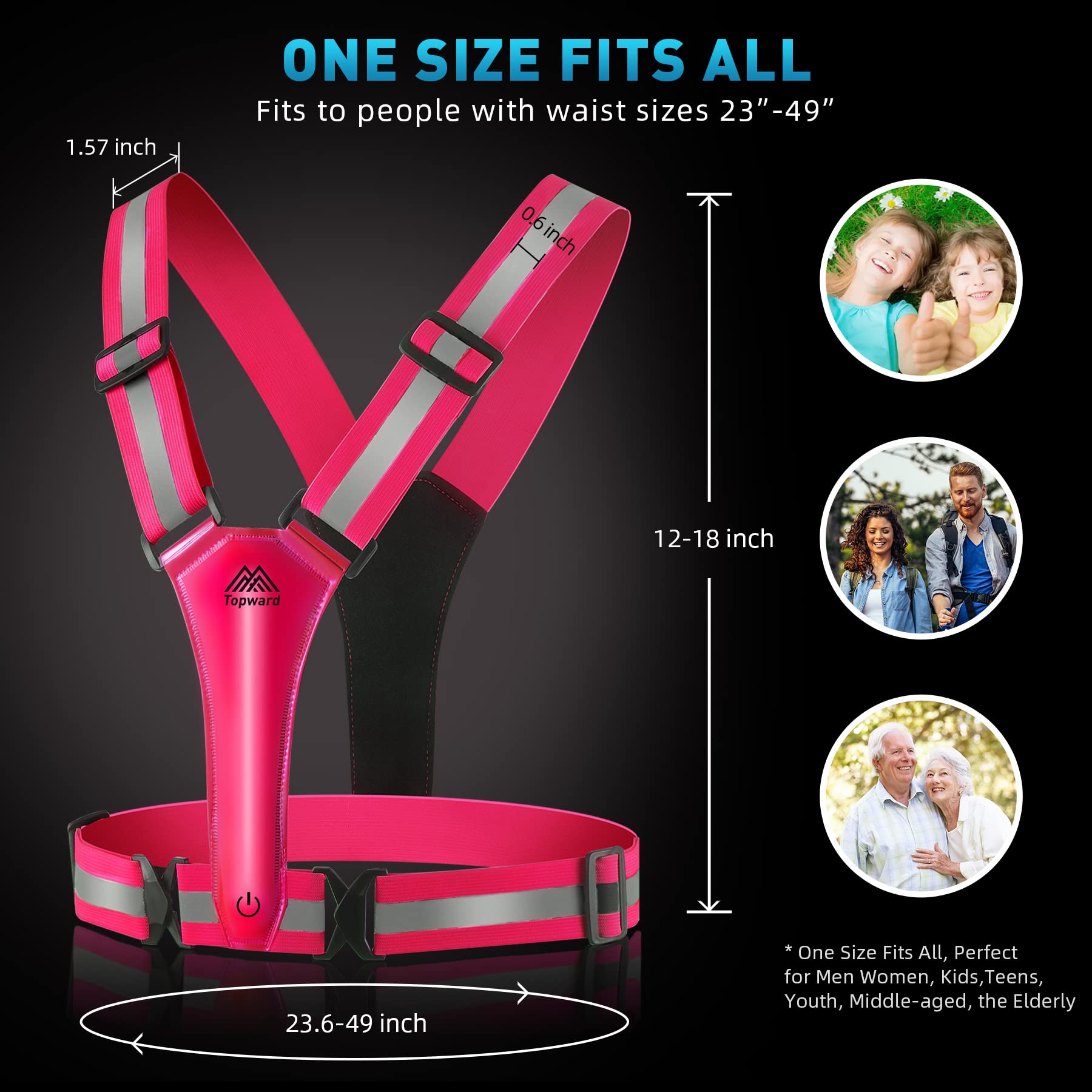 COMFORTABLE & ELASTIC & ADJUSTABLE - The ergonomic design of this LED reflective vest ensures your comfort when you wear it over any dress typically t-shirt, sports gear, jacket as per the season. Waist circumference expands from 23" to 49"; Shoulder strap: 12 - 26 inch; perfect gift for men/women/kids/teens/the elderly