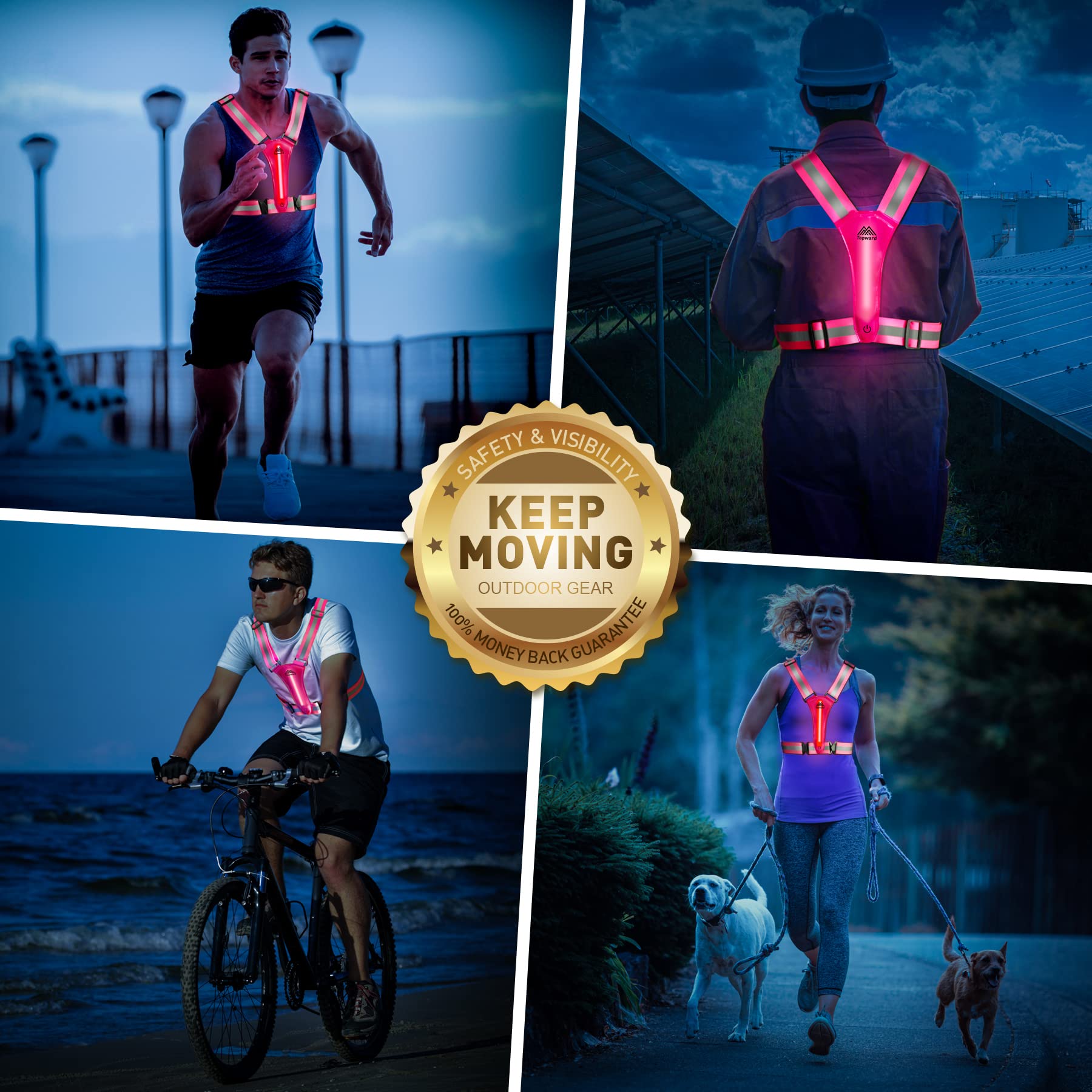 BE SEEN FROM A LONG DISTANCE - Topward LED Reflective Vest is an upgraded, new generation safety vest with LED flash lights both in front and back; Keep you safe for running, (dog)walking, riding, skiing and motorcycle, etc.