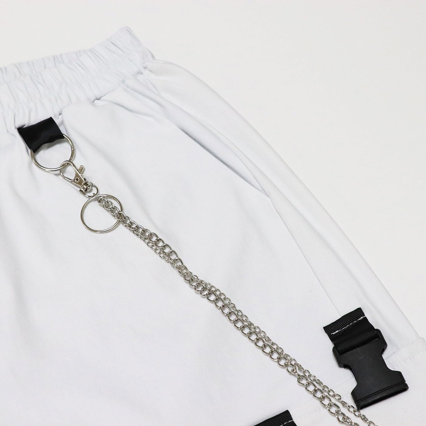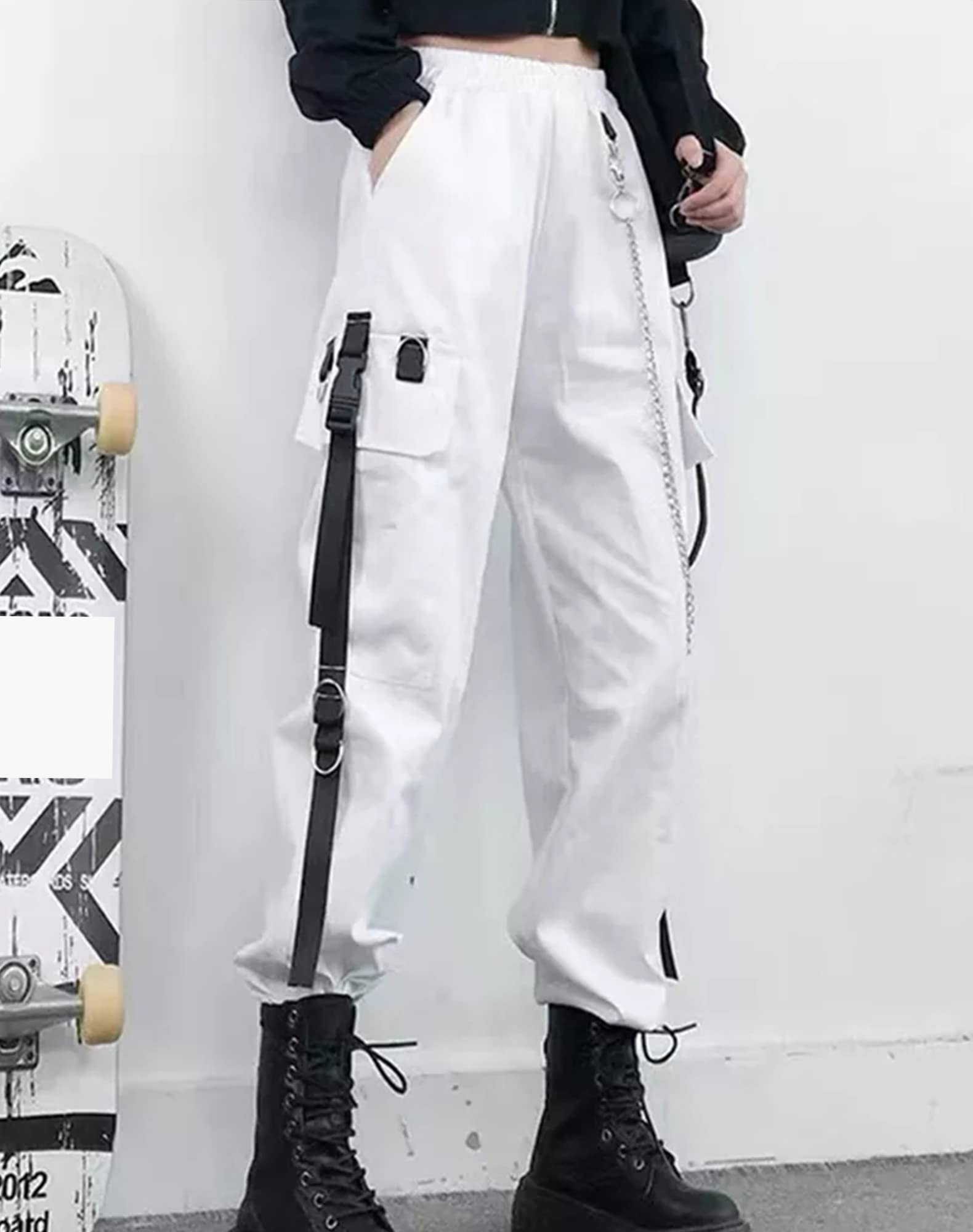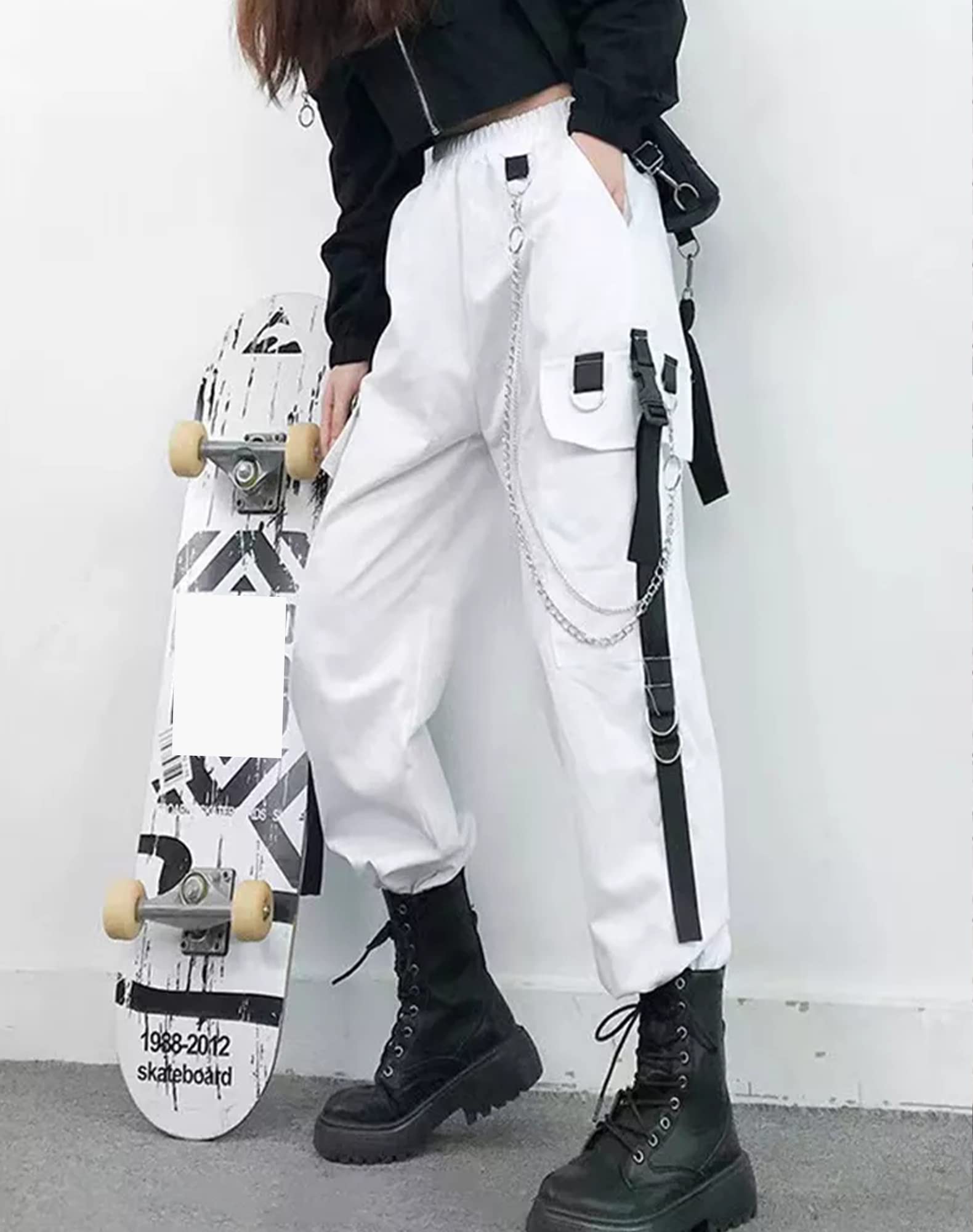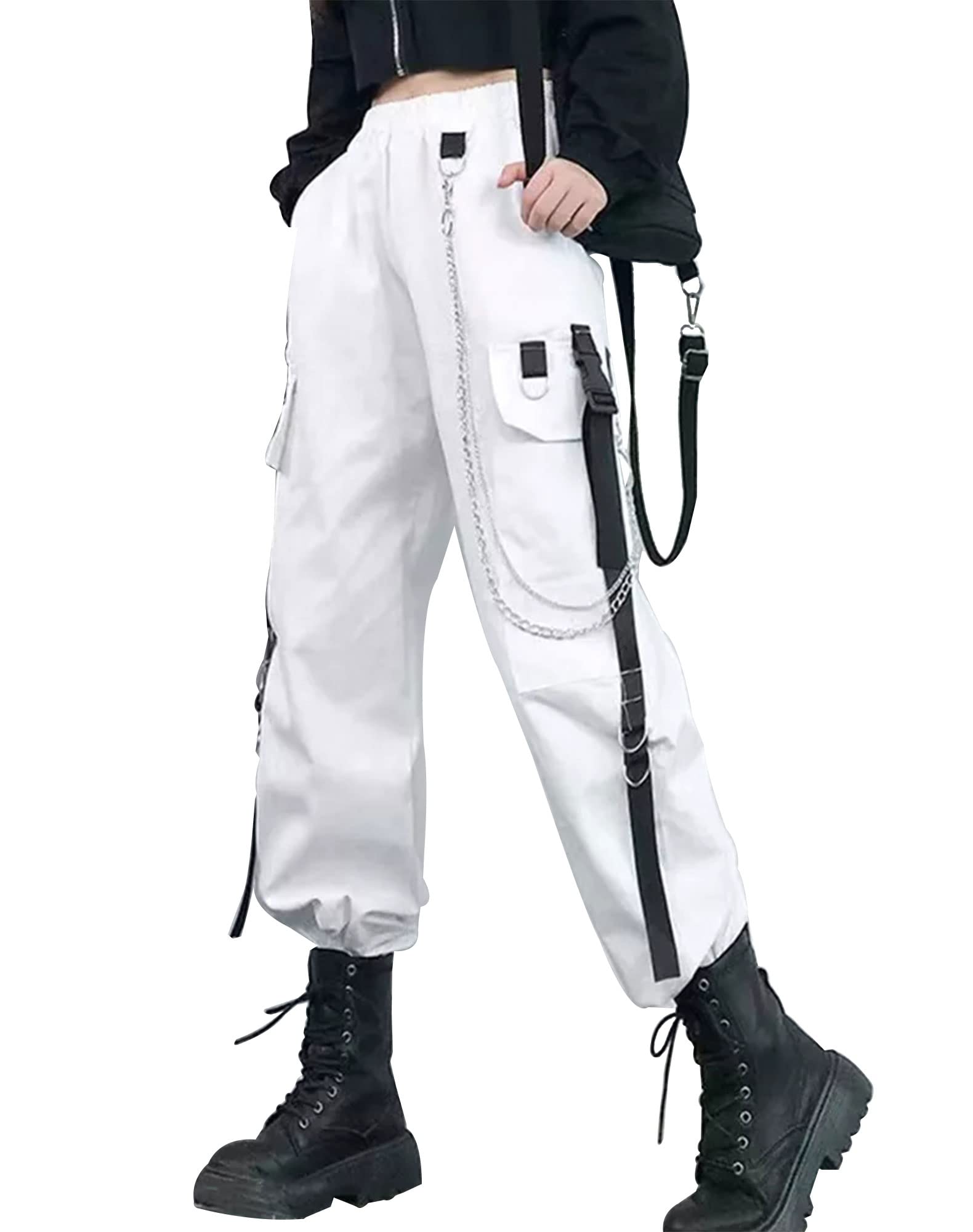 [Feature] High waisted cargo pants with chain, streetwear pants for women. The high waist overalls design with wide legs shows off your figure and creates a sexy and trendy look. The elastic waist ensures a perfect fit, and the multiple pockets provide ample storage space. Put on these emo pants and embrace a cooler and casual style