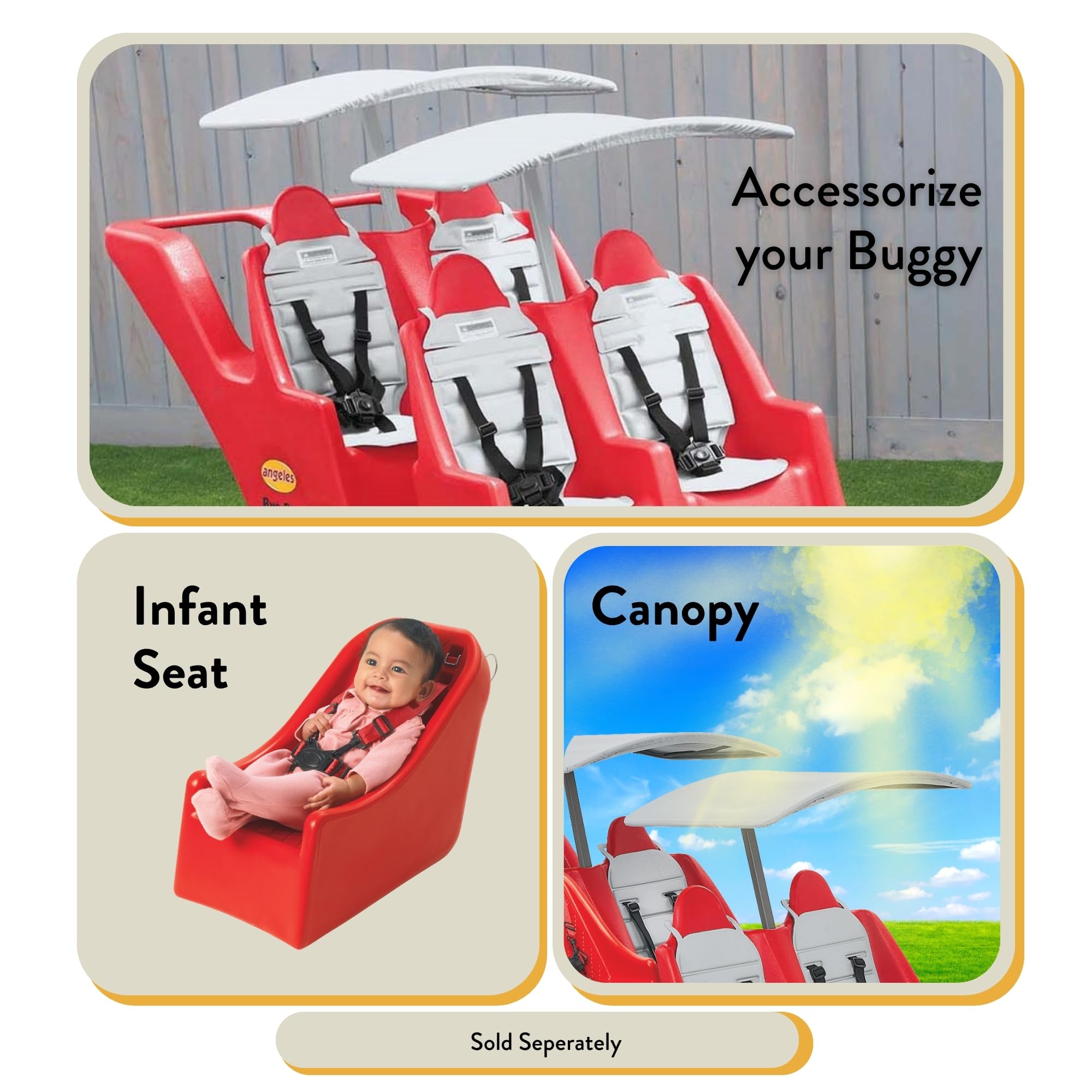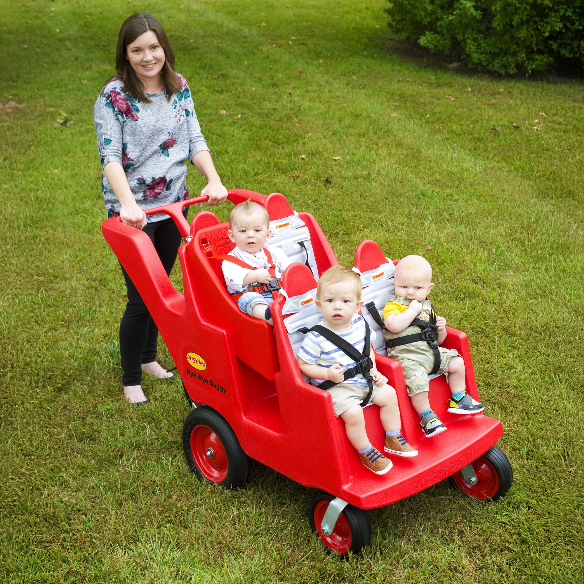 Children's Factory Angeles Bye-Bye Buggy: 4-Passenger Stroller for Daycare Daycare providers, this one's for you. The Angeles Bye-Bye Buggy is a multi-passenger stroller designed to make transporting young children easier and safer. This spacious buggy comfortably fits up to 4 children, each weighing up to 40 pounds. No more struggling with multiple single strollers, the Bye-Bye Buggy keeps everyone together for smoother outings. Each seat features replaceable, 5-point harnesses that are easy to fasten and keep kids securely buckled in during rides. Forget about flat tires! The Bye-Bye Buggy boasts special "fat tires" that are puncture-proof. Whether you're strolling on pavement, grass, or uneven ground, these tires ensure a comfortable ride for both you and the children. The 360-degree swiveling front wheels allow for tight turns and easy navigation through narrow hallways or crowded playgrounds. The sturdy, one-piece molded frame of the Bye-Bye Buggy is built to last, providing a secure and comfortable environment for your little passengers. A parking brake keeps the buggy secure when stopped, giving you peace of mind. The Bye-Bye Buggy is designed to fit through standard doorways, allowing for easy movement between rooms or outdoor adventures. Canopies are sold separately and a separate seat is required for children under 6 months old.