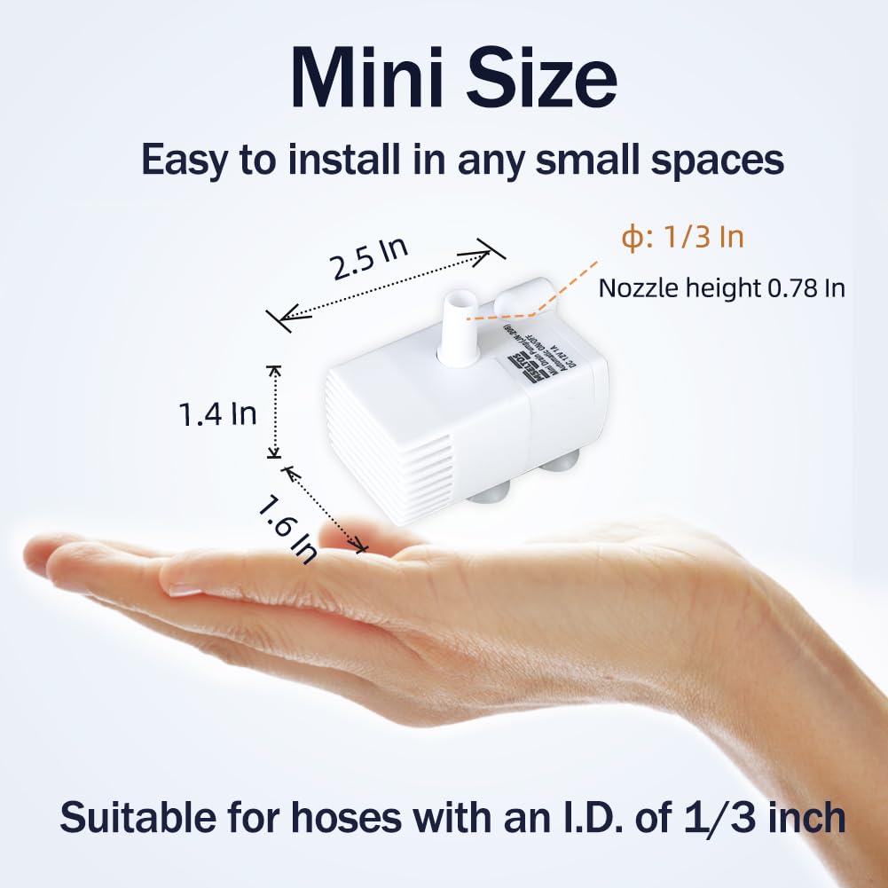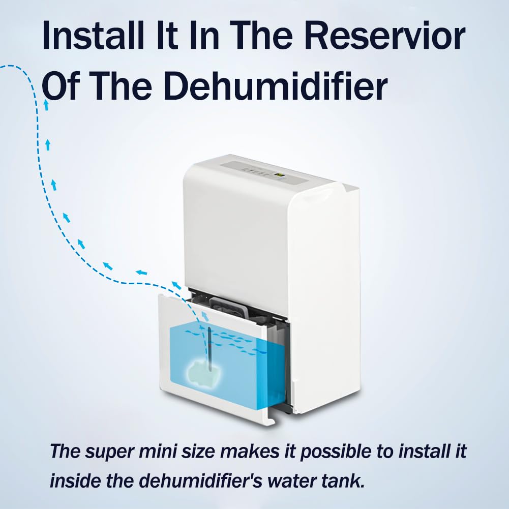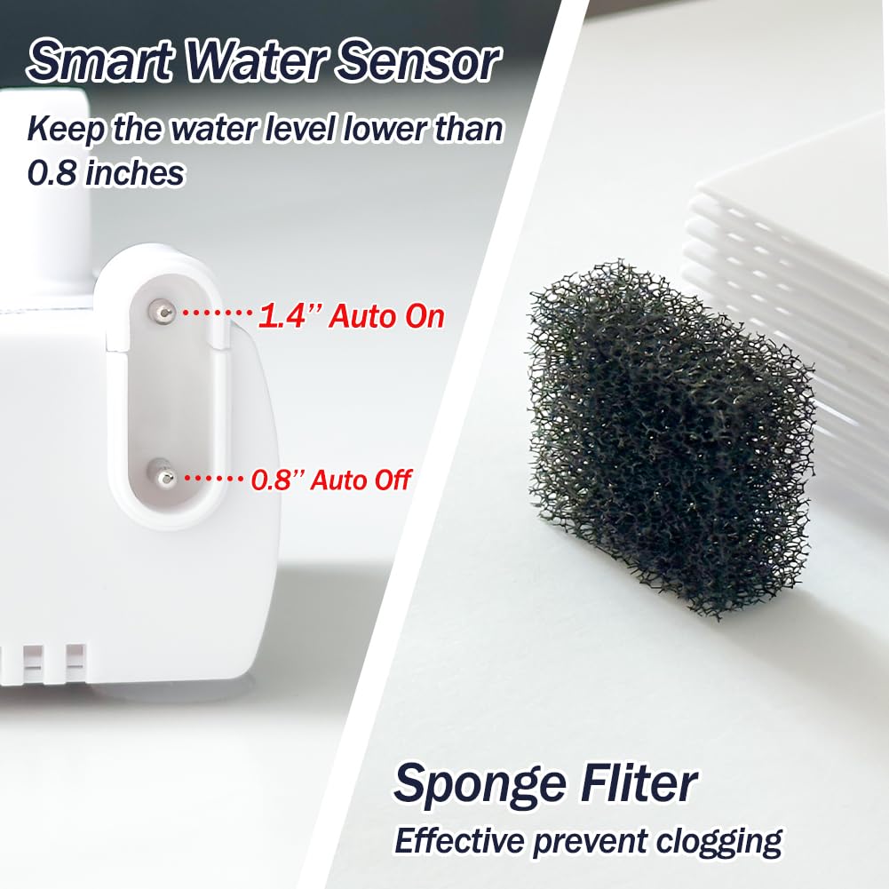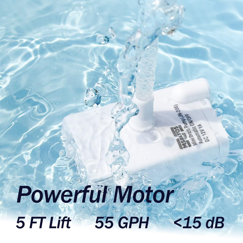 Automatic Mini Sump Pump for Condensate Removal - This compact and efficient mini sump pump is designed for hassle-free condensate removal from commercial ice machines, portable AC units, dehumidifier and other scenes. With a 5 ft max head and 55 GPH max flow rate, it can meet the vast majority of daily drainage needs. Its mini size (2.24" × 1.38" × 2.2") allows it to fit seamlessly into any water reservoir, making it a versatile solution for your drainage needs.