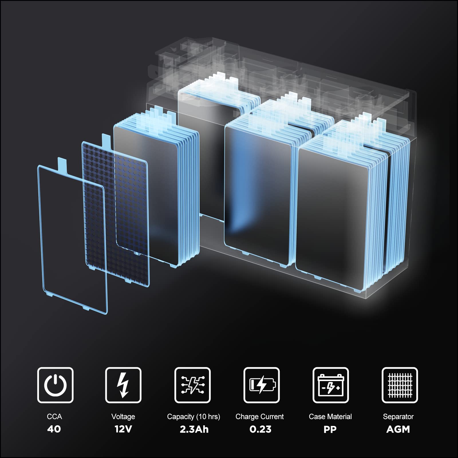 BATTERY TYPE --- YT4B BS Replacement, 12v 2.3ah, 40 CCA Sealed AGM Battery. Dimensions: 4.4 x 1.5 x 3.3 inch, Maintenance Free. No spills, no leaks, and no water to check. Rechargeable power sport battery with [- +] Tab Terminal.